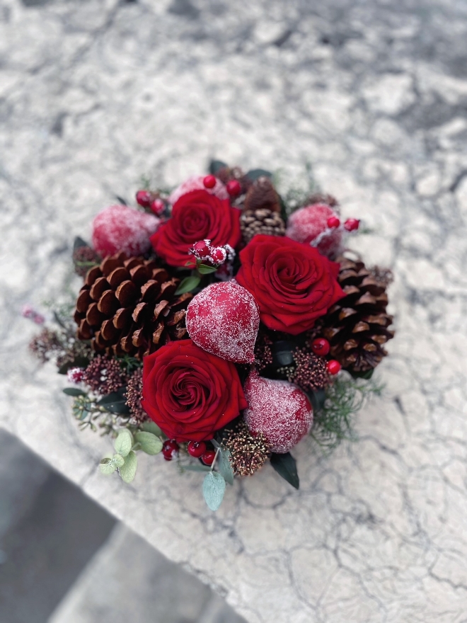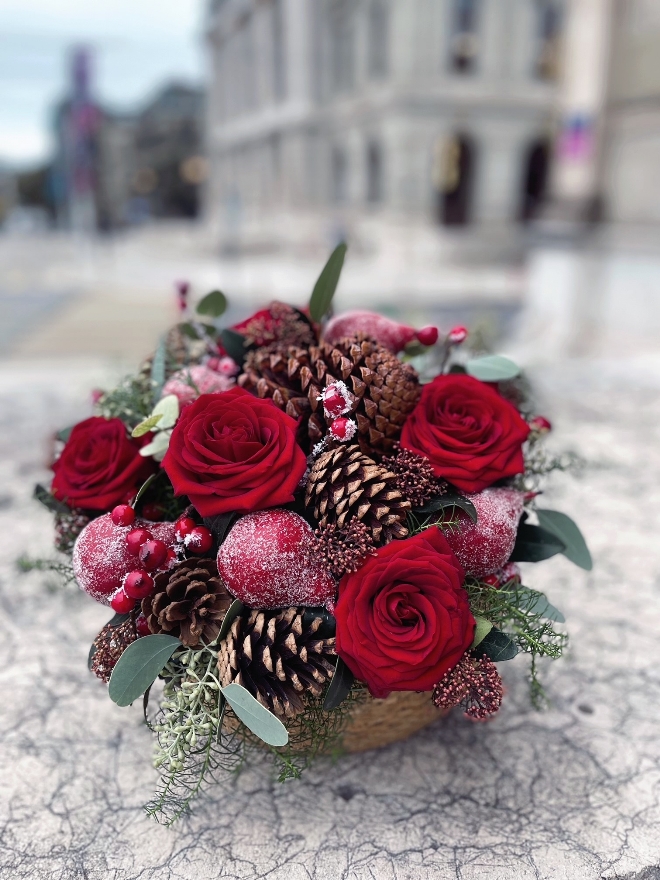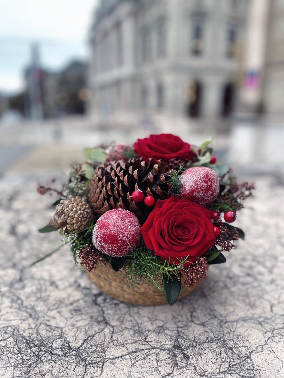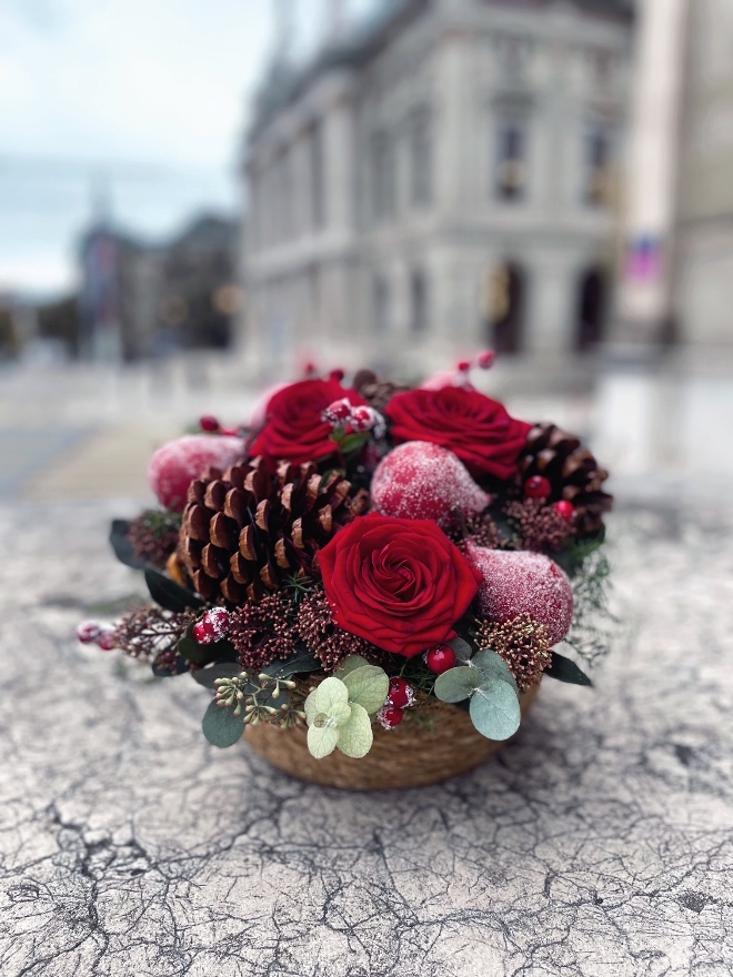 Notre petit arrangement Yule, c'est une invitation aux fêtes avant l'heure ! Conseil pour les arrangements de fleurs coupées : pour obtenir la plus grande satisfaction avec ces fleurs, nous vous conseillons de rajouter de l’eau fraîche quotidiennement. Chaque création florale est unique et réalisée avec le choix des fleurs du jour, en s’adaptant au mieux à vos envies et votre budget. Les photos vous donnent des idées du style d’arrangement que l’on peut réaliser, il s’agit d’inspiration. Le choix des fleurs ainsi que les couleurs peuvent varier. Fleuriot Fleurs propose également des plantes, des orchidées… Tous nos bouquets de fleurs, arrangements de fleurs et bouquets de roses sont confectionnées sur commande à Genève, par nos fleuristes. La réalisation d’une composition florale demande du temps, nous nous engageons à vous avertir dès que votre commande est prête. Commander des fleurs à Genève n’a jamais été aussi simple !