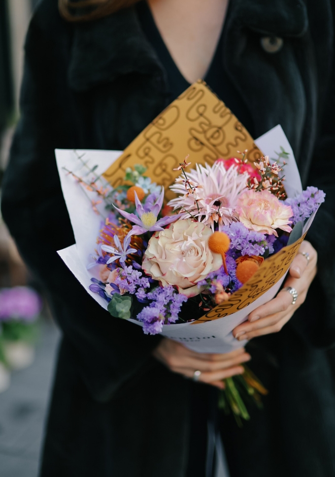 Le bouquet Vicon est nommé en hommage à Vicon, notre artiste résidente du mois de mars, dont l’univers graphique, spontané et vibrant illumine actuellement nos vitrines de la Corraterie. Son intervention en live sur nos vitres a transformé l’espace en une scène artistique vivante, créant un dialogue fort entre art et fleuristerie. Inspiré par son énergie créative, ce bouquet réunit des fleurs de saison aux nuances violine, saumon et orange, subtilement relevées d’une touche de rose. Un contraste audacieux et lumineux, à l’image de son travail, pensé pour apporter caractère et modernité à vos intérieurs.