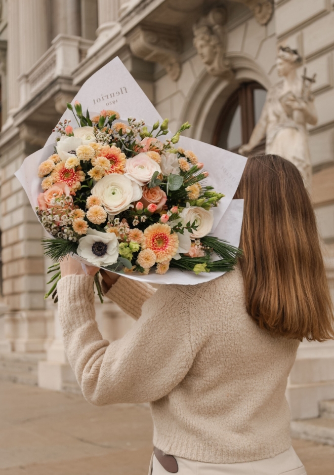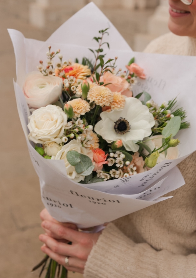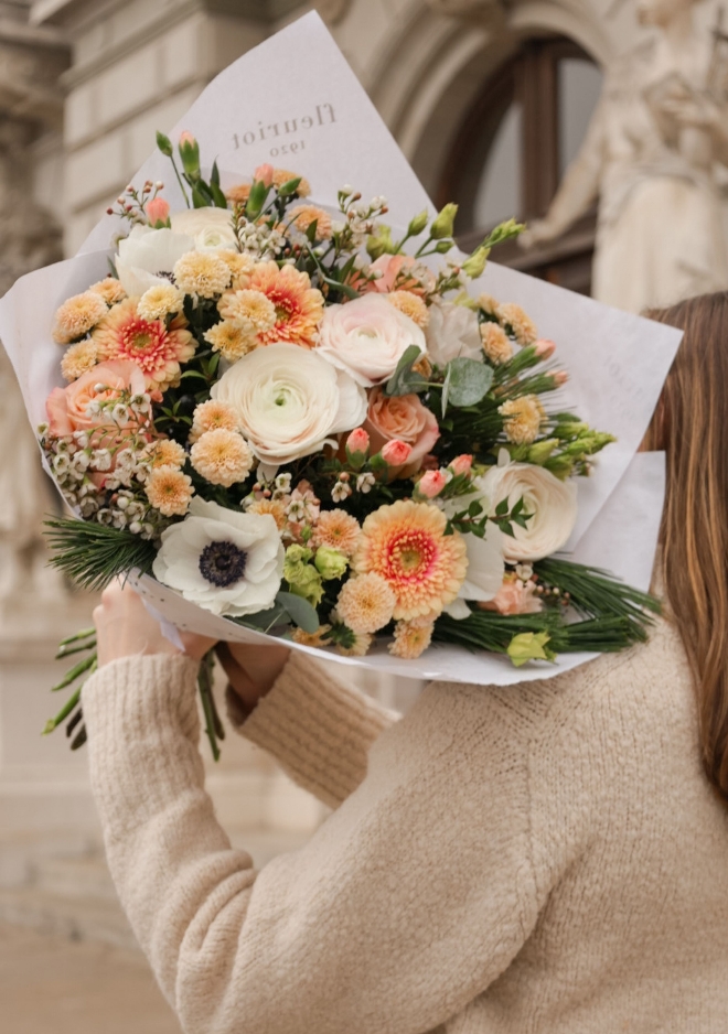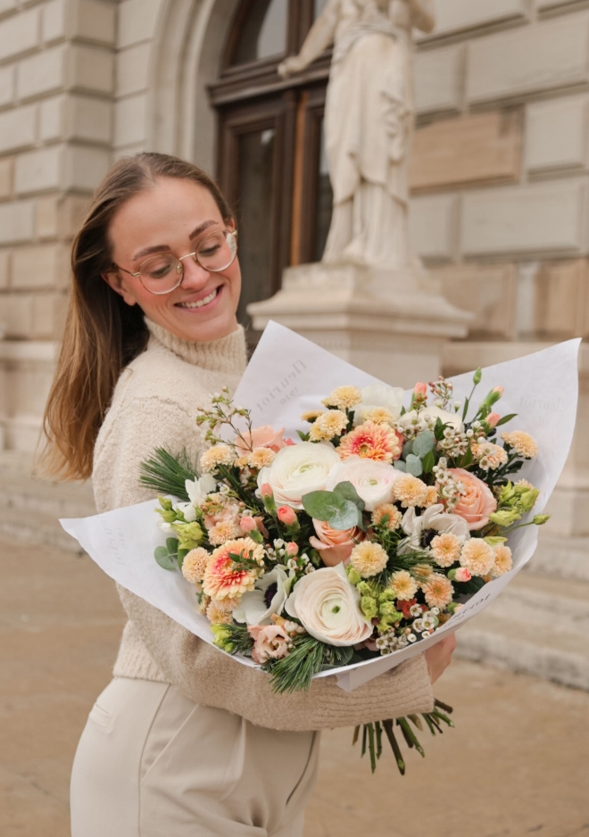 Le bouquet O-vives met en lumière les stars de l’hiver, réunies dans une palette douce et lumineuse : saumon, rose poudré et blanc éclatant. Il se compose d’anémones élégantes, de renoncules généreuses, d’œillets raffinés, de santinis abricot et du délicat Wax Blondie, qui apporte légèreté et chaleur. Ce bouquet évoque la douceur d’un matin d’hiver, une lumière feutrée et une atmosphère chaleureuse. Parfait pour illuminer un intérieur ou offrir une parenthèse poétique au cœur de la saison froide.