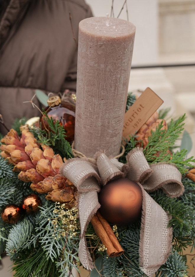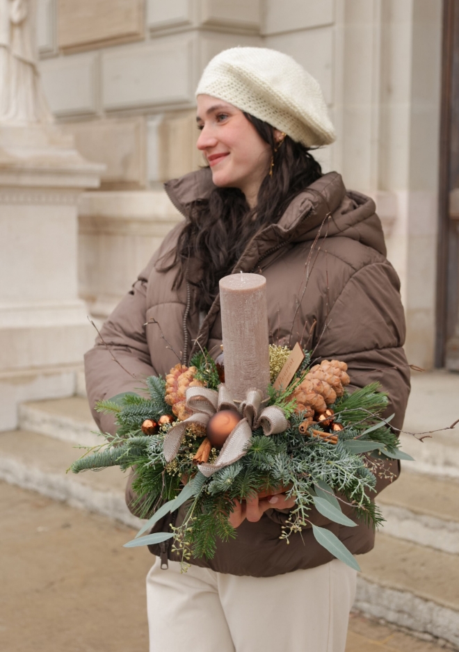 Cet arrangement raffiné mêle la fraîcheur des conifères naturels à l’élégance d’une bougie brune, créant une atmosphère douce, chaleureuse et résolument gourmande. Inspiré du thème Praline, il se décline dans des nuances brunes, caramel et chocolatées, évoquant la douceur hivernale et le confort d’un moment cocooning. Les décorations soigneusement choisies — éléments naturels, ornements chauds, touches boisées et détails lumineux — mettent en valeur la richesse des conifères et apportent une harmonie subtile et réconfortante. Un centre de table durable, parfumé et délicatement chaleureux, parfait pour accompagner les soirées d’hiver et offrir une ambiance élégante et enveloppante.