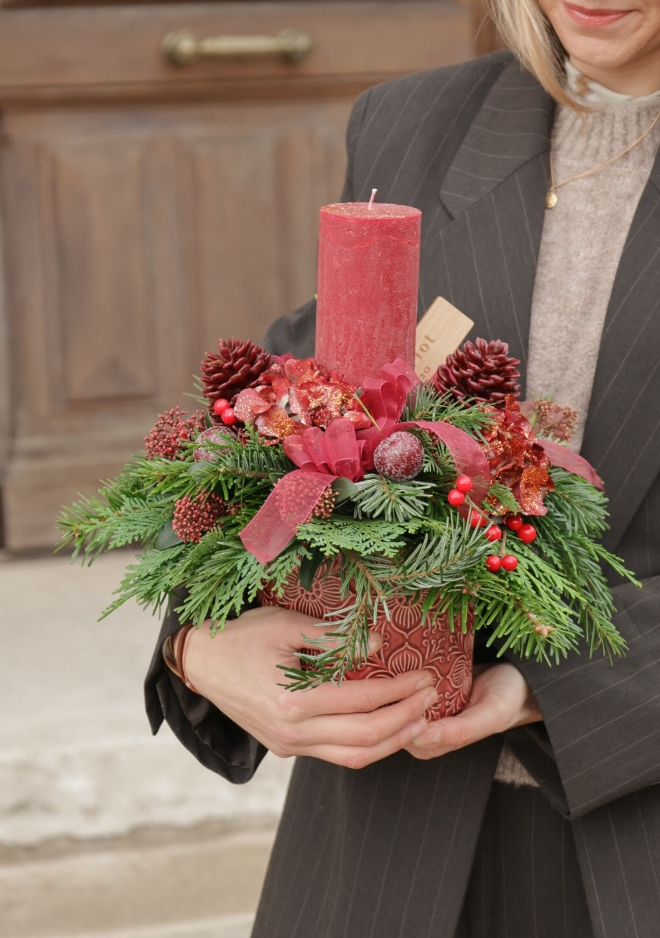 Cet arrangement hivernal allie la fraîcheur des conifères naturels à la chaleur d’une bougie rouge, créant une ambiance douce et lumineuse. Inspiré du thème Cacao Poker, il se décline dans de riches tonalités rouges, chaleureuses et profondes, évoquant la générosité et la gourmandise de l’hiver. Les décorations soigneusement sélectionnées — baies, ornements rouges, touches boisées et éléments élégants — soulignent la structure généreuse des conifères et offrent un contraste raffiné avec la lumière de la bougie. Un centre de table chaleureux, parfumé et durable, parfait pour embellir les soirées hivernales et accompagner les moments cocooning.