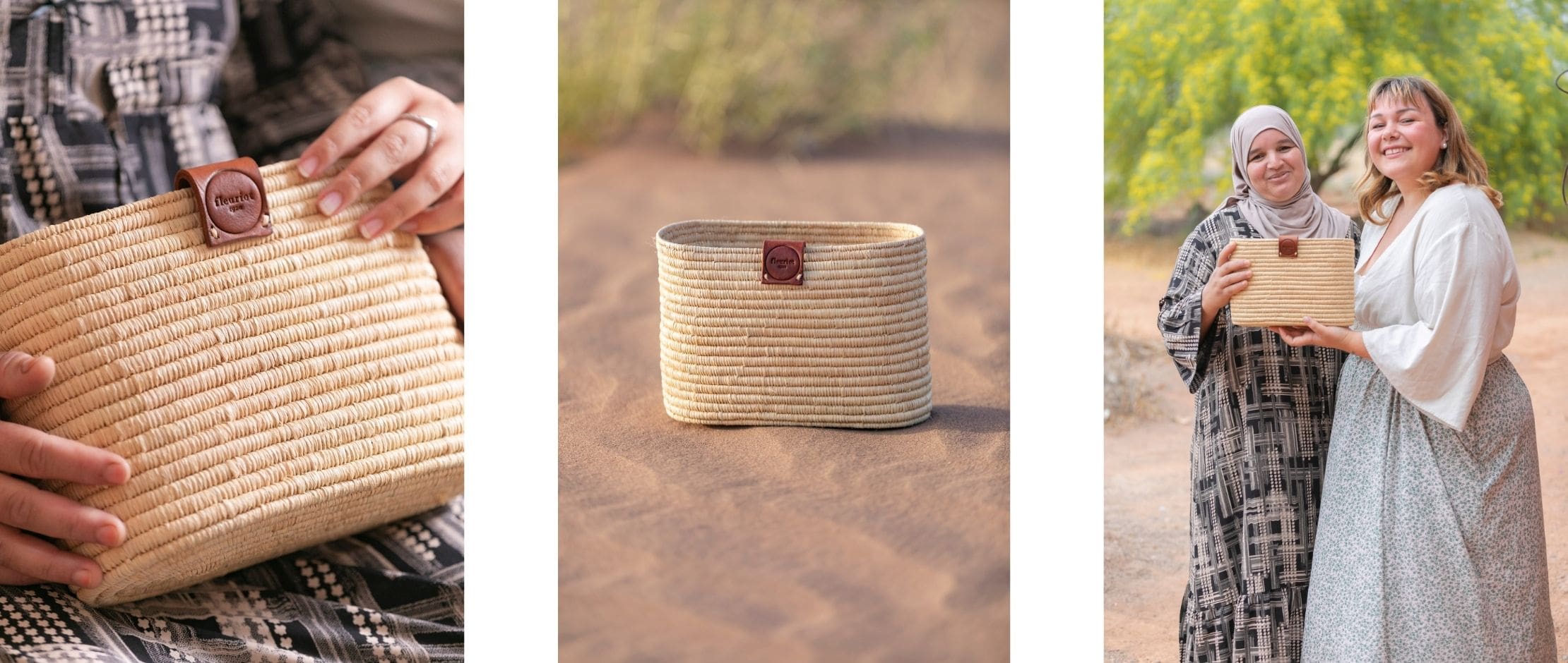 We collaborate with two women-led cooperatives located near Marrakech, rooted in ancestral craftsmanship. Each basket is entirely handmade by women artisans using Doum palm fibers, carefully harvested and sun-dried in their village.