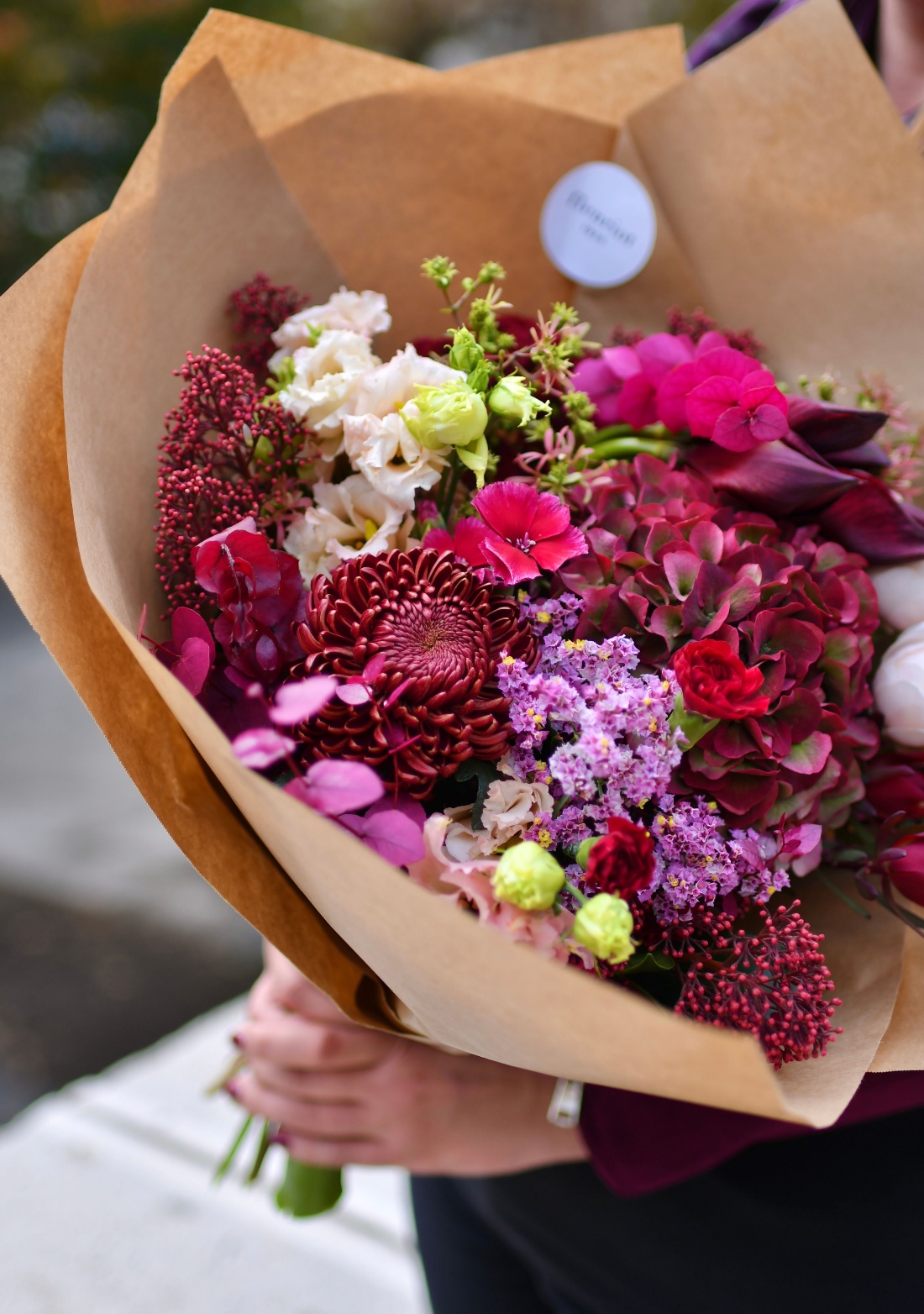 Un doux murmure d'automne, le bouquet November Rain incarne parfaitement l'esprit de novembre avec ses nuances profondes de bordeaux et ses fleurs automnales. C’est un hymne aux jours gris et aux pluies fines qui dansent sur les trottoirs de Genève. Alors, qu’il pleuve ou qu’il vente, avec November Rain entre les mains, c’est l’automne qui s’invite dans votre intérieur ! Le bouquet sur la photo est à 85.-. Chaque création florale est unique et réalisée avec le choix des fleurs du jour, en s’adaptant au mieux à vos envies et votre budget. Tous nos bouquets de fleurs, arrangements de fleurs et bouquets de roses sont confectionnées par nos fleuristes. La réalisation d’une composition florale demande du temps, nous nous engageons à vous avertir dès que votre commande est prête.