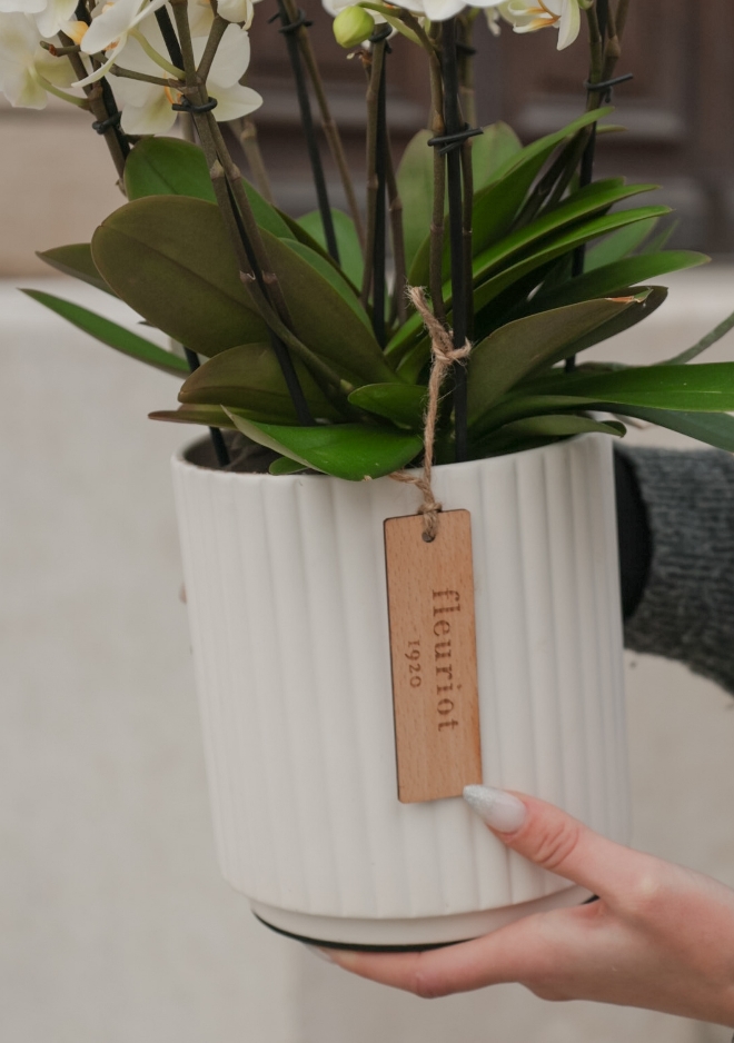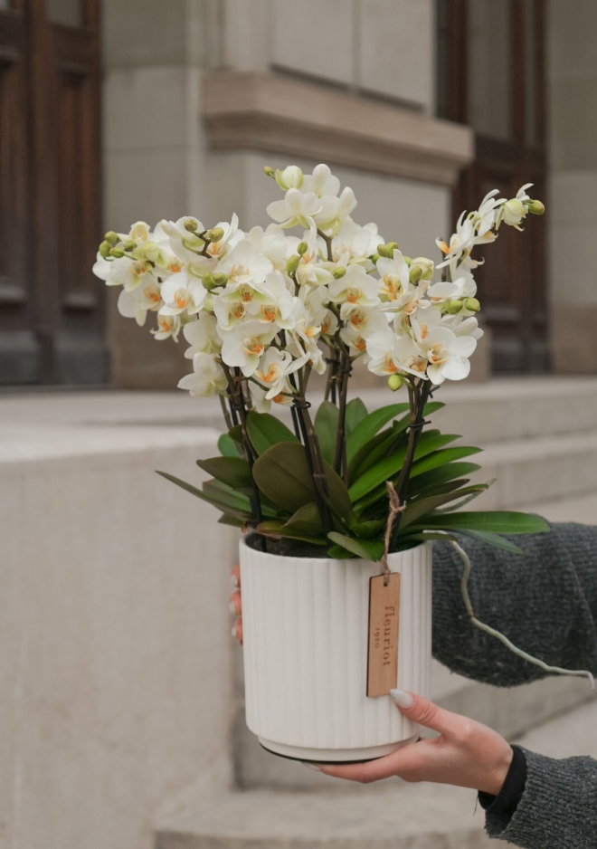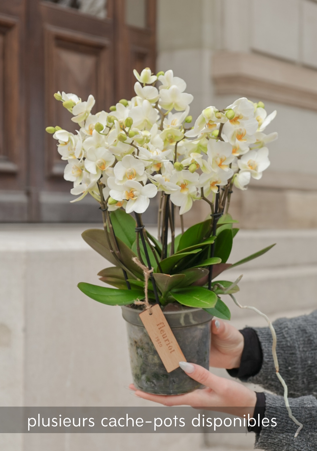 Orchidée Bellissimo blanche D15 – Raffinement en pleine floraison L’orchidée Bellissimo blanche, avec ses grands fleurons élégants et sa silhouette généreuse, est un véritable symbole de pureté et de sophistication. Présentée en pot de diamètre 15 cm, elle est idéale pour sublimer un intérieur avec classe et sobriété. Vendue sans cache-pot, mais une sélection de modèles adaptés est disponible pour compléter son allure. Une plante facile d’entretien, à arroser modérément une fois par semaine, qui refleurit chaque année.