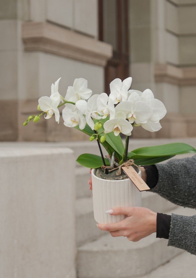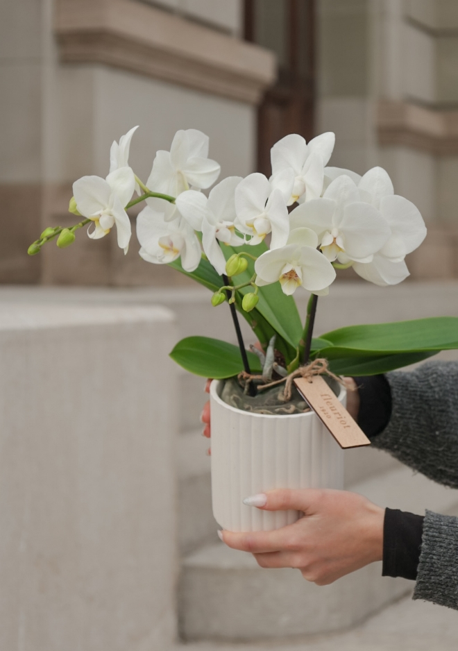 Orchidée Tabl’O blanche D12 – Élégance compacte et contemporaine L’orchidée Tabl’O blanche séduit par ses fleurs délicates et lumineuses, portées par un format compact en pot de diamètre 12 cm. Idéale pour les petits espaces, les tables, les comptoirs ou les rebords de fenêtre. Son design moderne et épuré en fait un choix parfait pour une décoration sobre et raffinée. Vendue sans cache-pot, avec plusieurs options disponibles pour personnaliser sa présentation. Facile d’entretien, elle s’arrose légèrement une fois par semaine et refleurit chaque année.