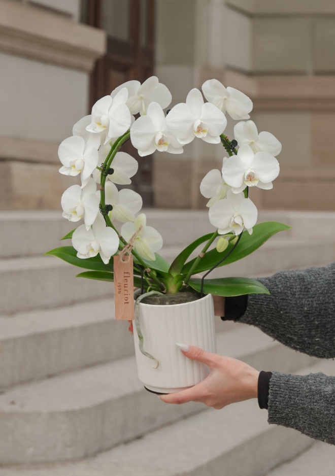 Orchidée Aurora blanche D12 – Courbe délicate & floraison raffinée L’orchidée Aurora blanche se distingue par son port arqué en demi-cercle et ses fleurs blanches élégantes, formant une silhouette douce et équilibrée. En pot de diamètre 12 cm, elle est idéale pour apporter légèreté et sophistication à n’importe quel espace. Vendue sans cache-pot, avec plusieurs options compatibles disponibles. Une orchidée facile à entretenir, à arroser une fois par semaine, qui refleurit fidèlement chaque année.