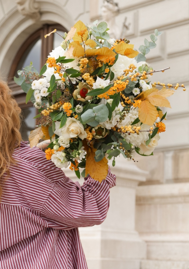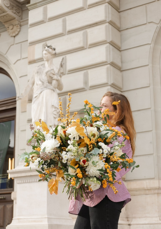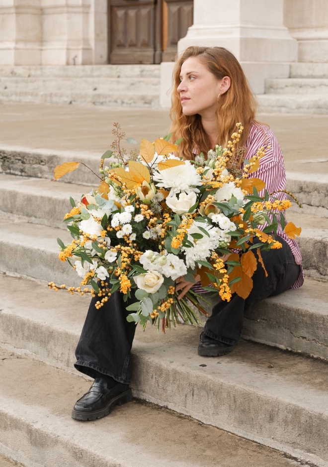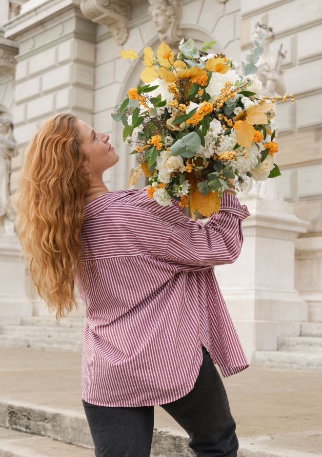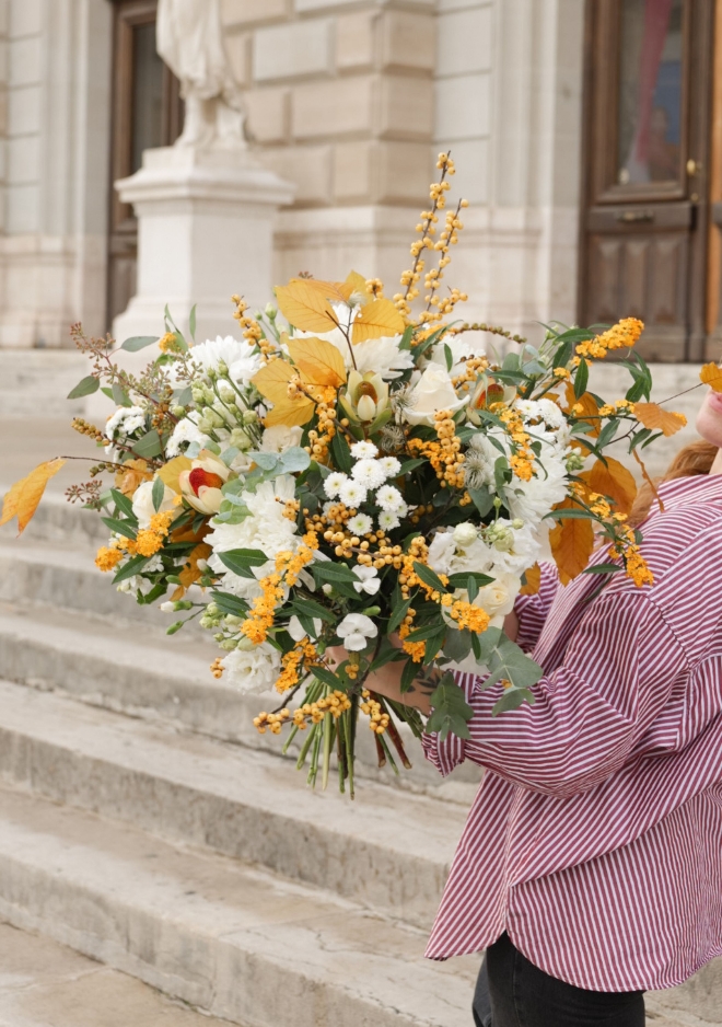 Entre la lumière pâle de novembre et la chaleur des forêts dorées, le bouquet Malagny célèbre la douceur de la saison. Composé de chrysanthèmes Antonov blancs, d’ilex de la région aux baies jaune miel, de feuilles de hêtre aux reflets dorés et de roses européennes crème, il évoque un automne apaisé, lumineux et raffiné. Ses tonalités sobres mais chaleureuses en font un choix élégant pour toutes les occasions — un bouquet de transition, entre neige et lumière d’automne. 💡 Astuce : à offrir avec notre belle bougie HelloCandle, pour faire entrer une douce lumière dans votre intérieur.