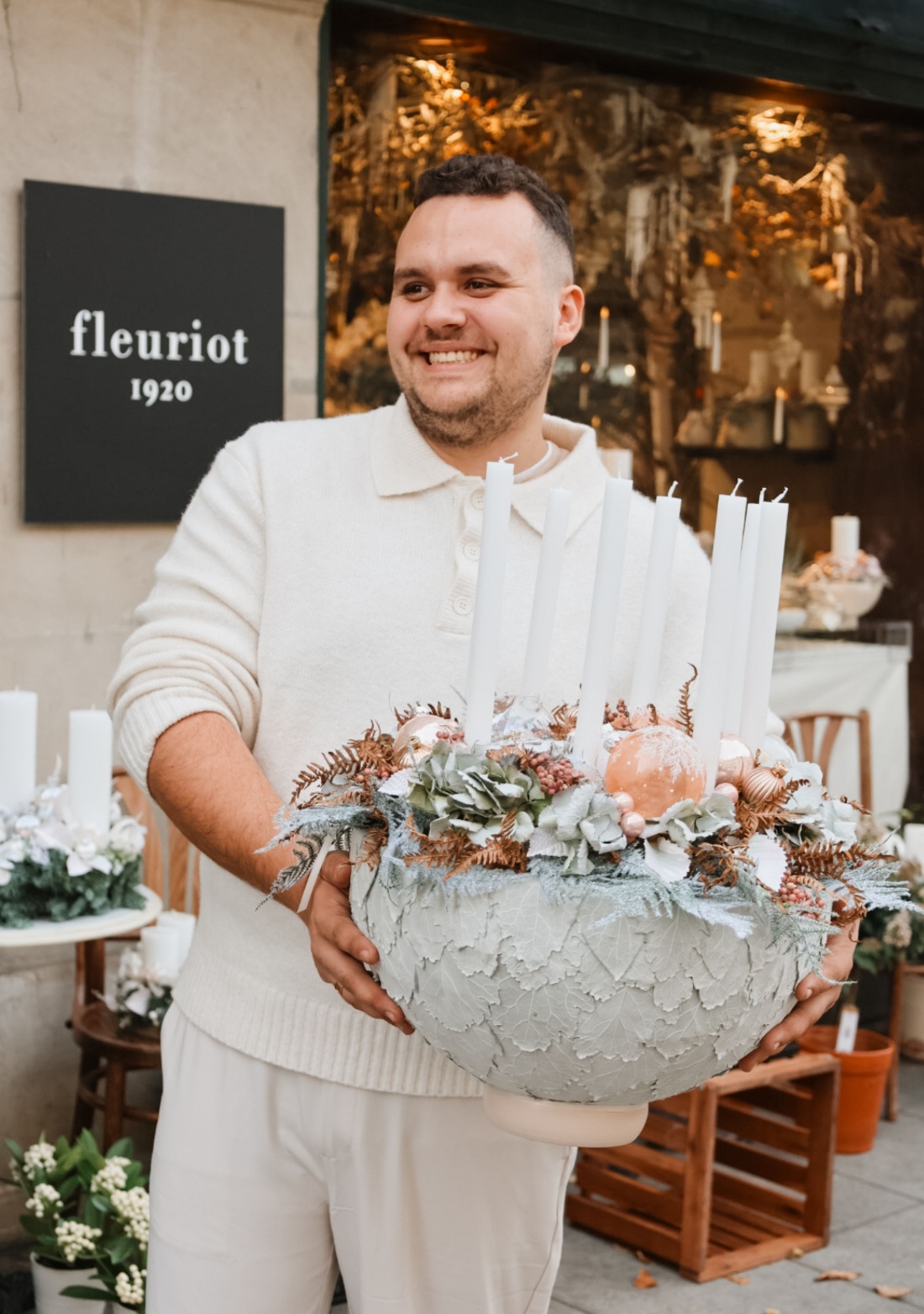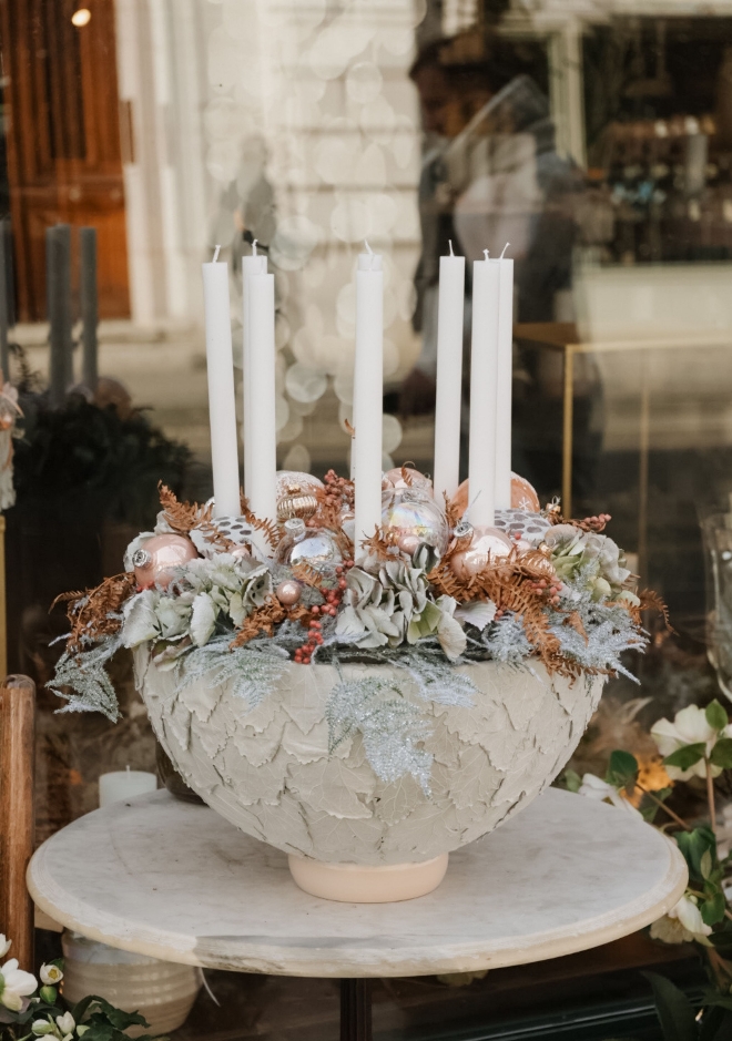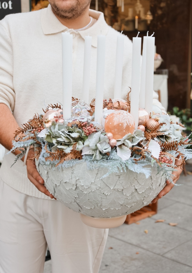 Tout en douceur et en raffinement, la coupe “Chocolat Blanc” mêle feuilles de sénecio séchées, végétaux stabilisés et décors délicats dans une harmonie de tons blancs, crème et dorés. Ses six bougies flamme blanches apportent une lumière pure et scintillante, évoquant la brillance d’un glaçage sucré. Chaque détail a été travaillé avec soin pour créer une composition hivernale élégante et contemporaine, parfaite pour illuminer une table ou un espace de vie. Un arrangement poétique et sophistiqué, inspiré par la douceur du chocolat blanc et la beauté naturelle des matières.