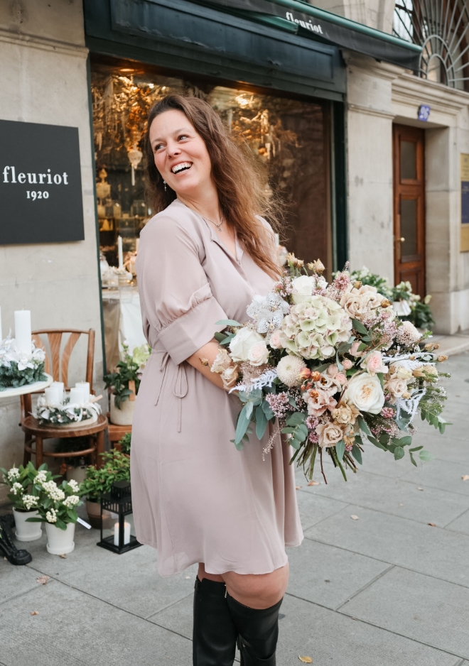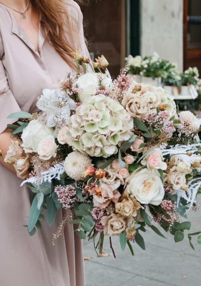 Tout en douceur et en délicatesse, le bouquet Nâcre dévoile une harmonie de couleurs pastel inspirées du thème Chocolat Blanc. Il réunit de magnifiques chrysanthèmes Dusty Latte, des roses blanches parfumées O’Hara, un hortensia rose/vert (selon arrivages) ainsi que de belles fleurs de saison, pour un ensemble raffiné, tendre et lumineux. Avec son style rond et généreux, Nâcre apporte une touche de poésie et d’élégance à votre intérieur — un bouquet doux, frais et intemporel, idéal pour offrir ou se faire plaisir.