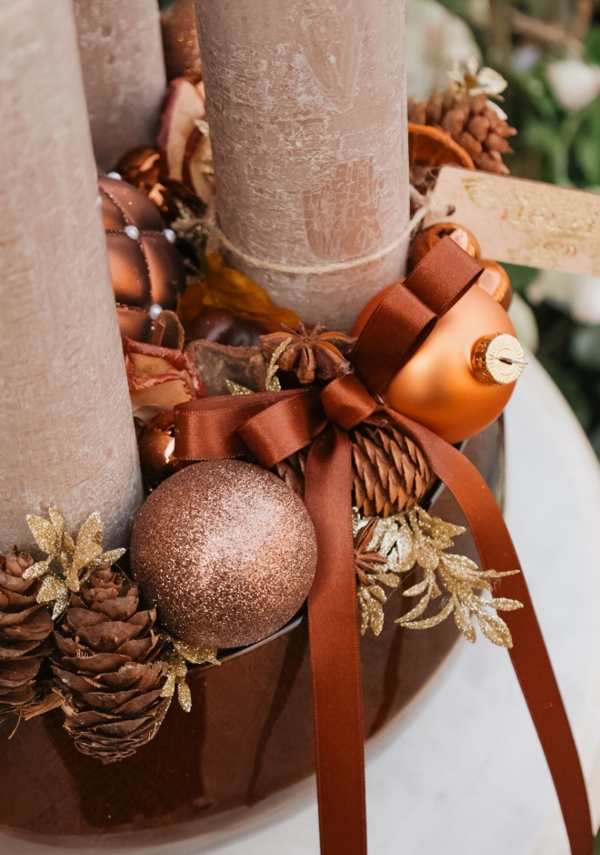 Présenté dans un superbe vase en verre fumé Dutz, l’arrangement Chocolate Mousse célèbre la douceur et la chaleur du thème chocolat Praliné. Avec ses quatre bougies soigneusement disposées et sa décoration gourmande aux tonalités caramel, noisette et chocolat au lait, cette création diffuse une atmosphère à la fois chaleureuse, festive et délicatement raffinée. Le verre fumé apporte une touche de modernité, tandis que les éléments décoratifs évoquent la texture onctueuse d’une mousse au chocolat. Une composition élégante et généreuse, parfaite pour illuminer votre intérieur de lumière douce et de charme hivernal.