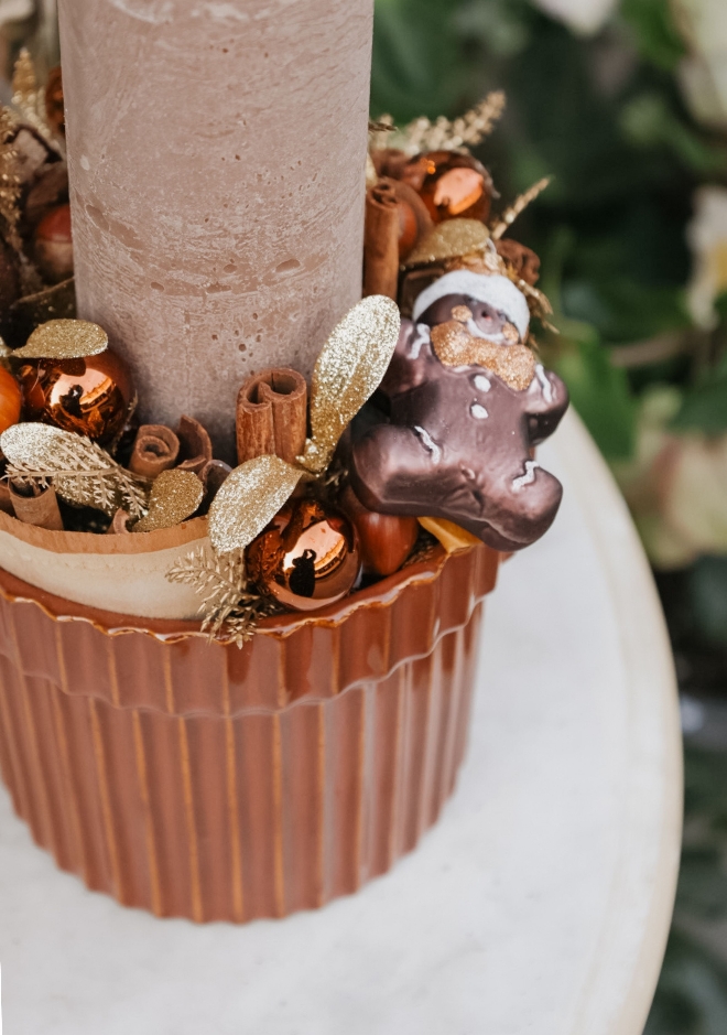 Inspiré des nuances réconfortantes du chocolat au lait et du caramel, l’arrangement Toffee célèbre la chaleur et la gourmandise des fêtes. Présenté dans une céramique orangée lumineuse, il est décoré d’éléments gourmands et d’une bougie centrale qui diffuse une lumière douce et dorée. Ses teintes ambrées et ses détails délicats évoquent la douceur d’un dessert de fête, à savourer des yeux. Toffee — une création chaleureuse et raffinée, idéale pour offrir ou illuminer la maison d’un éclat sucré.