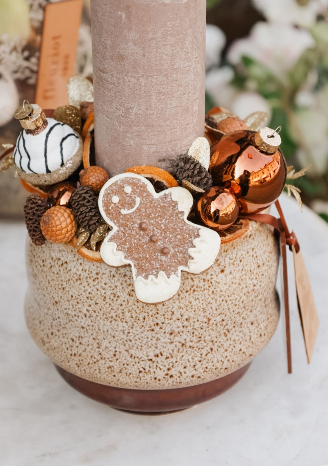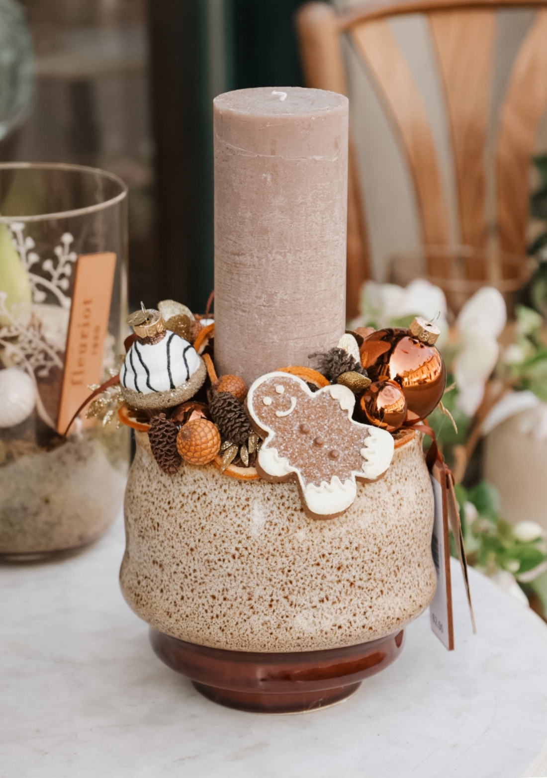 Tout en nuances chocolatées et beiges, l’arrangement Fudge évoque la tendresse et la gourmandise d’un caramel fondant. Présenté dans une jolie céramique couleur chocolat, il marie des tonalités claires et sucrées pour une ambiance douce et raffinée. Sa bougie beige, au cœur de la composition, diffuse une lumière délicate qui réchauffe subtilement l’atmosphère. Un arrangement à la fois élégant et réconfortant, parfait pour illuminer la saison d’hiver d’une touche de douceur artisanale.