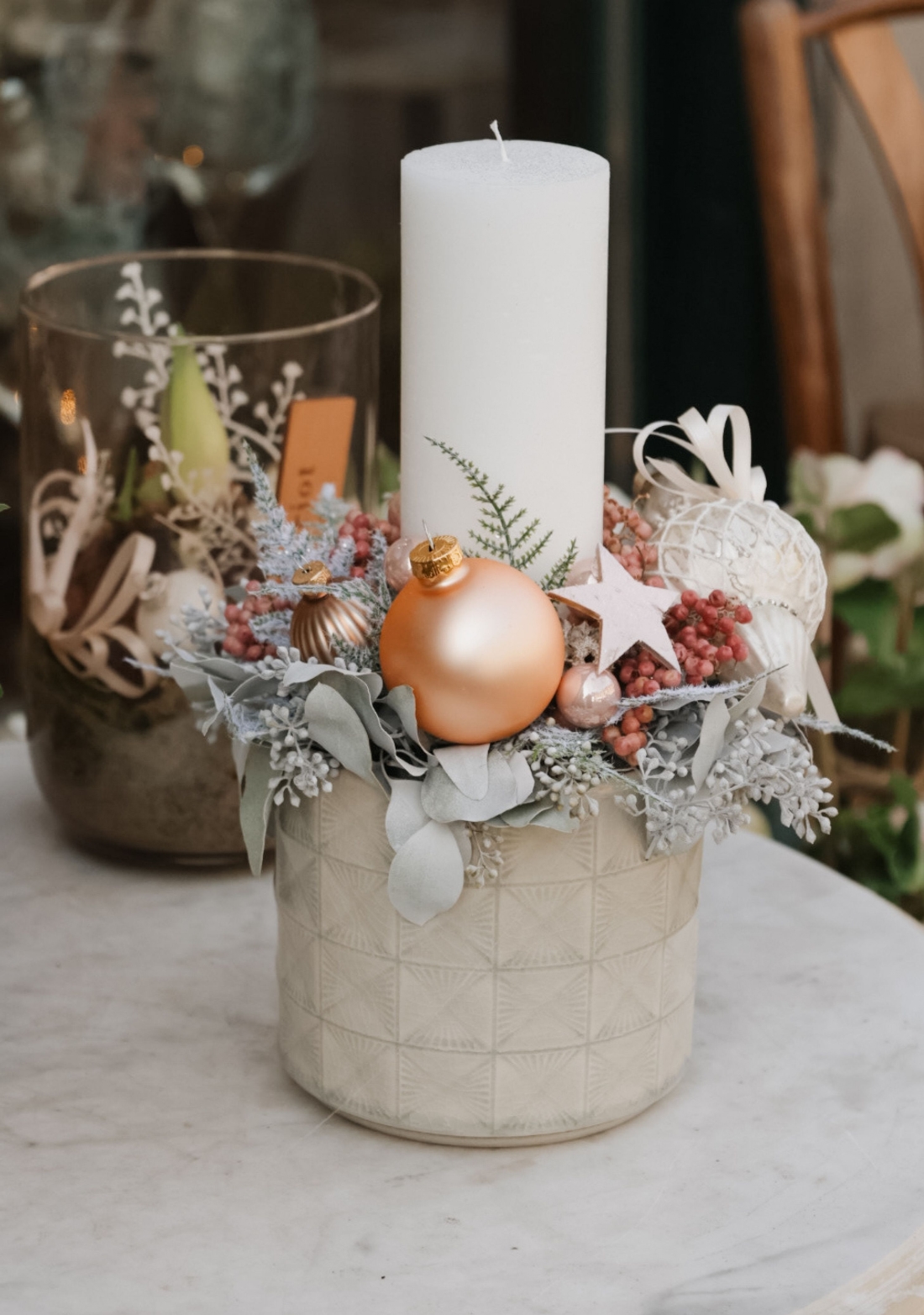 Élégant et lumineux, l’arrangement Sparkle capture toute la magie scintillante du thème “Chocolat Blanc”. Sa bougie blanche s’illumine au cœur d’une composition aux nuances crème, ivoire et dorées, rehaussée de détails délicats qui rappellent la finesse d’un flocon ou d’un glaçage sucré. Subtile et festive, cette création diffuse une lumière douce et chaleureuse, idéale pour illuminer vos soirées d’hiver avec élégance. Sparkle — une touche d’éclat et de pureté, comme un souffle de neige dorée posé sur votre table de fête.