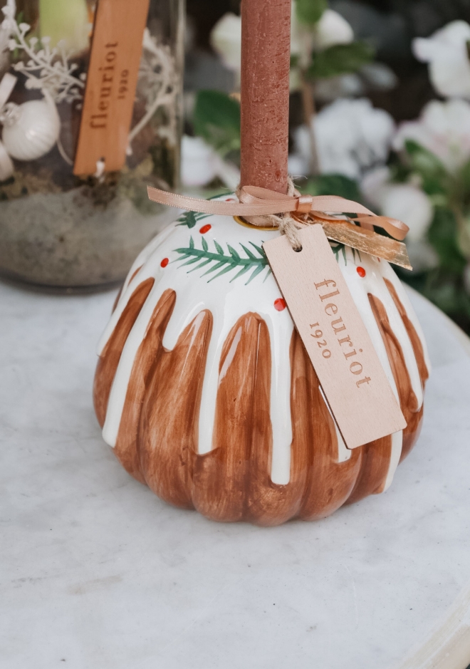 Tout en rondeur et en douceur, l’arrangement Pudding évoque la chaleur réconfortante d’un dessert de fête. Présenté dans une céramique façon pudding, il est surmonté d’une bougie flamme caramel qui diffuse une lumière ambrée et délicatement sucrée. La bougie artisanale, fabriquée à la main à Genève par les EPI, apporte une touche locale et authentique à cette création pleine de charme. Une pièce gourmande et élégante, idéale pour illuminer vos soirées d’hiver avec une note chaleureuse et raffinée.