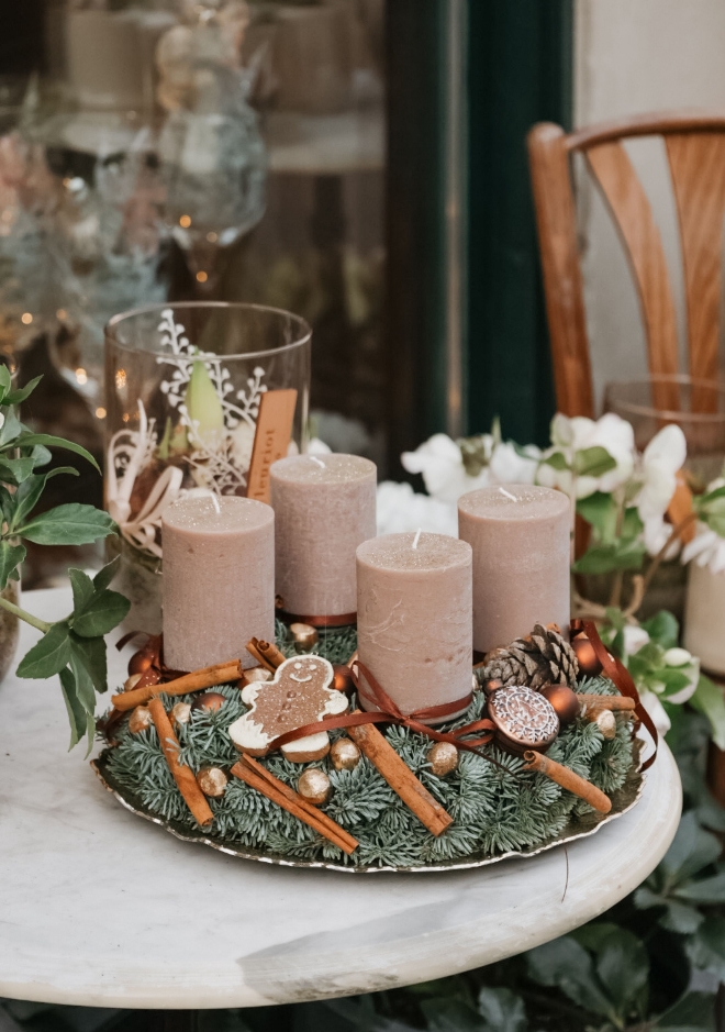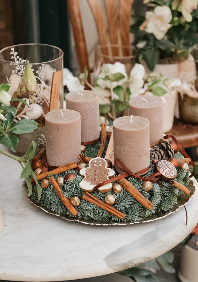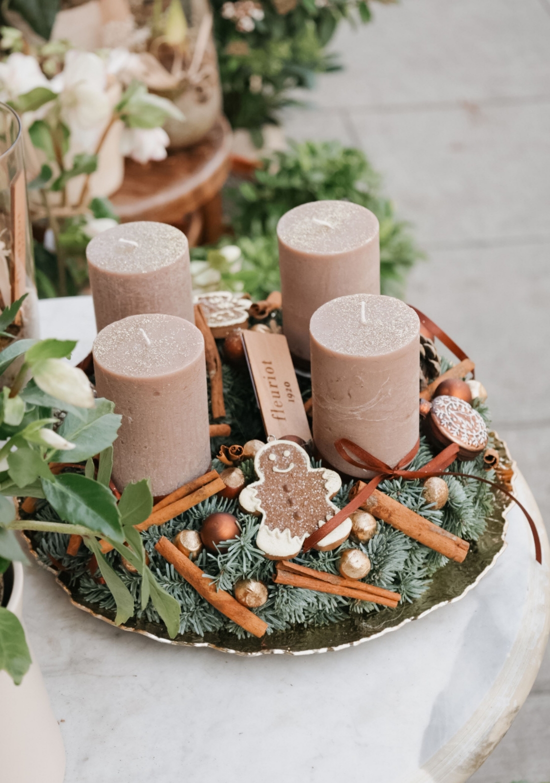 Inspirée de notre thème gourmand “Praliné”, cette couronne de l’Avent mêle avec raffinement teintes chocolatées, caramel doré et éclats ambrés. De petite taille, elle trouve parfaitement sa place sur une table basse ou au centre de votre table de fête, pour un décor à la fois chaleureux et élégant. Selon la tradition de l’Avent, allumez une bougie chaque dimanche jusqu’à Noël – ou laissez les quatre bougies scintiller ensemble pour une ambiance magique. Les bougies artisanales, fabriquées à la main à Genève par les EPI, ajoutent une touche locale et authentique à cette création unique. Une couronne gourmande et lumineuse, qui célèbre la douceur et la beauté du temps de l’Avent.