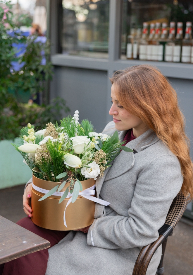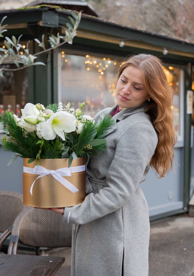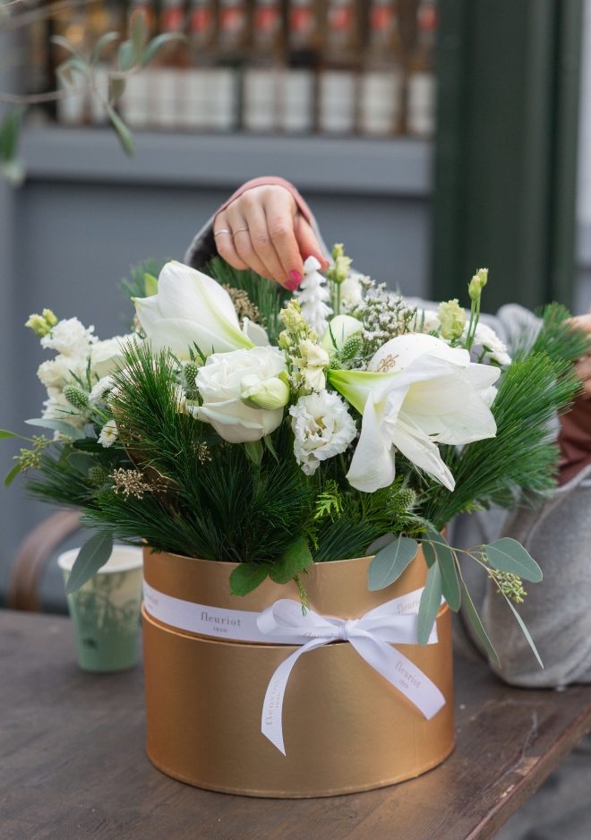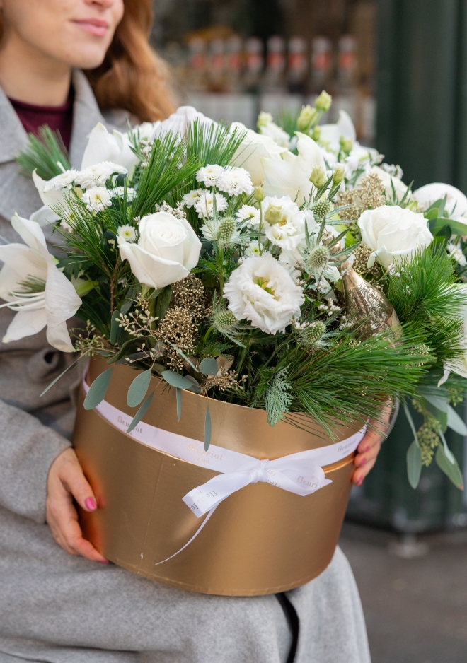 Élégante et intemporelle, la boîte fleurie Golden se décline en trois tailles et se distingue par sa finition dorée raffinée. Elle accueille un ensemble de fleurs blanches de saison, soigneusement sélectionnées pour leur délicatesse et leur tenue. L’arrangement est sublimé par un assortiment de conifères, offrant une touche hivernale et une excellente durabilité. Harmonie entre pureté du blanc et éclat du doré, la boîte Golden apporte une atmosphère chaleureuse et festive, parfaite pour offrir ou décorer un intérieur avec élégance.