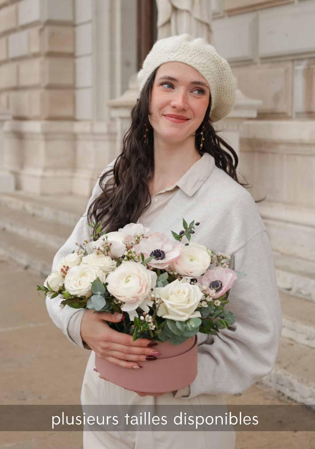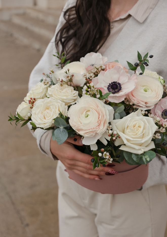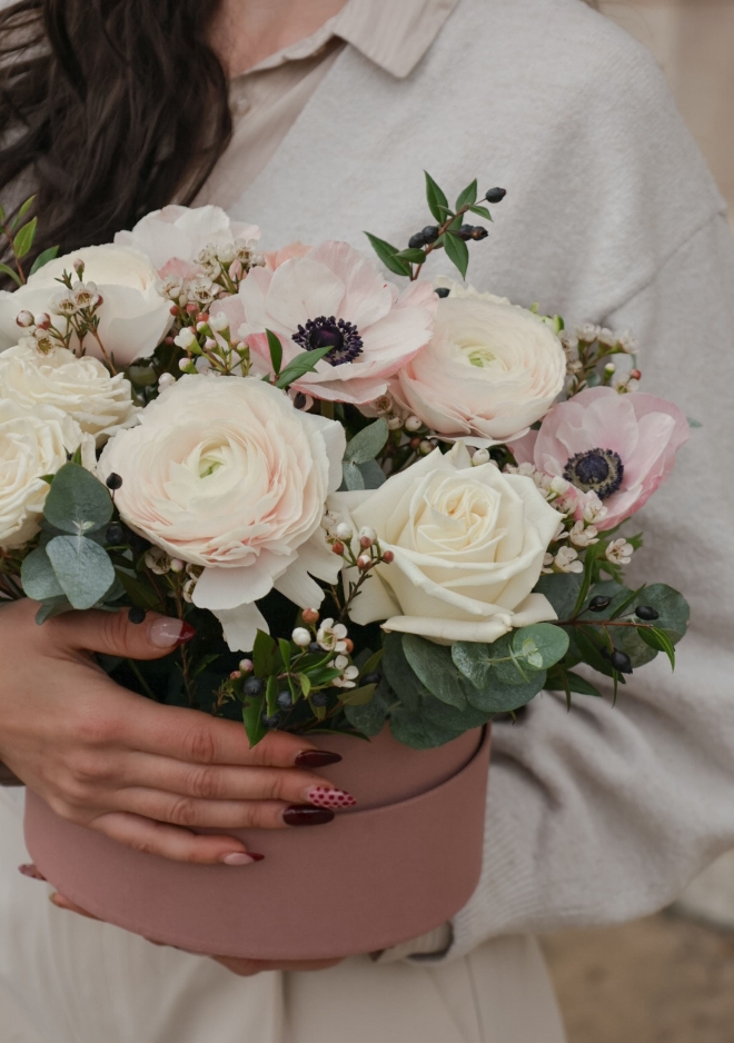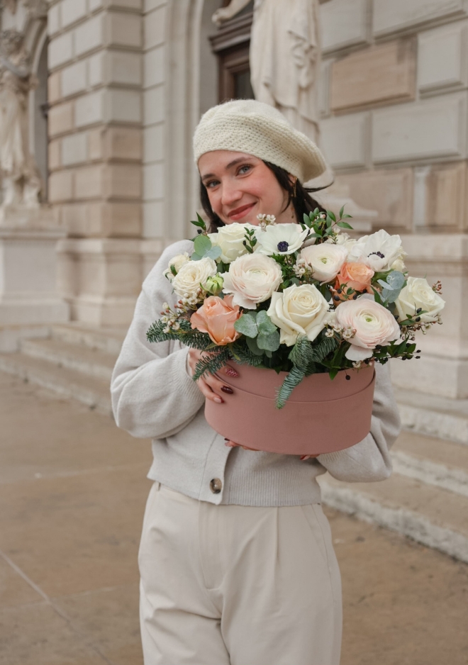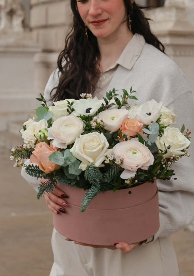 La boîte fleurie ovale Powder célèbre la délicatesse des fleurs de saison dans une harmonie tendre et raffinée. Elle est composée de renoncules Hanoï, d’anémones poudrées et de roses pastel, créant un ensemble doux, lumineux et élégant. Une boîte pleine de grâce, pensée pour accompagner les moments de tendresse, offrir une parenthèse poétique ou sublimer un instant précieux.