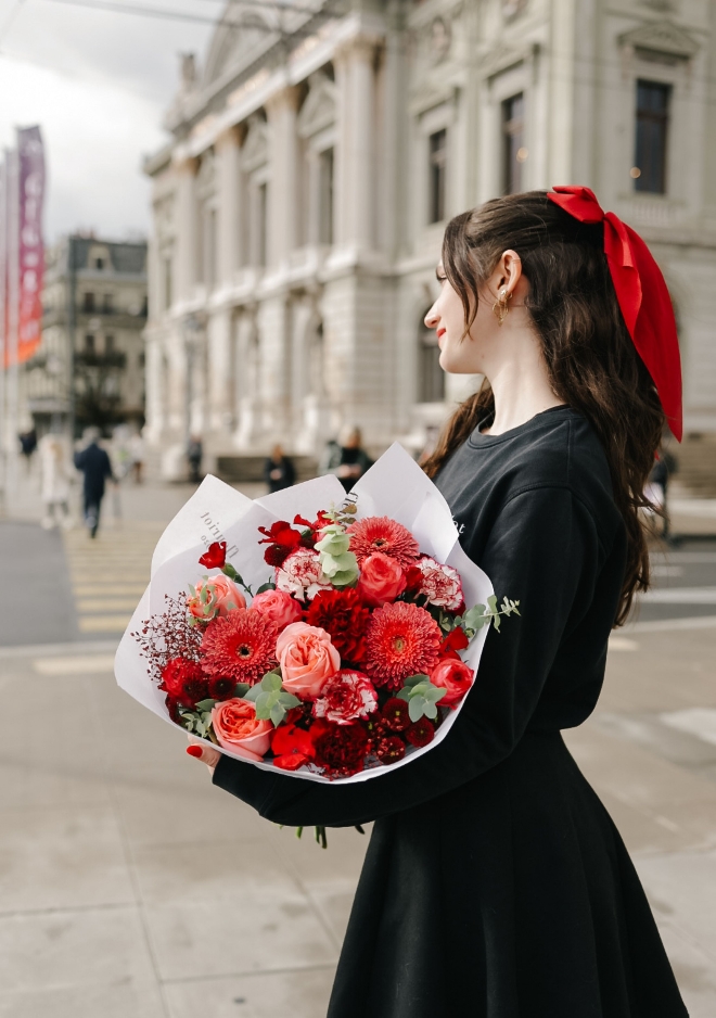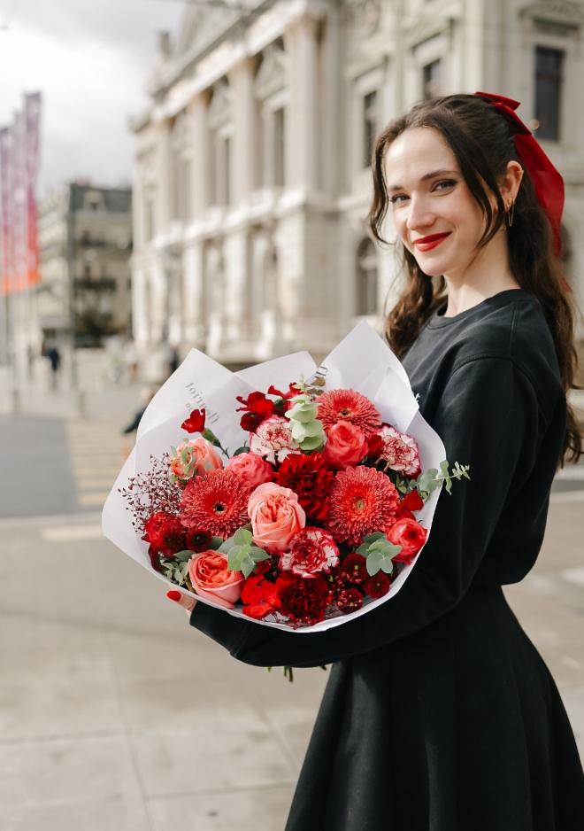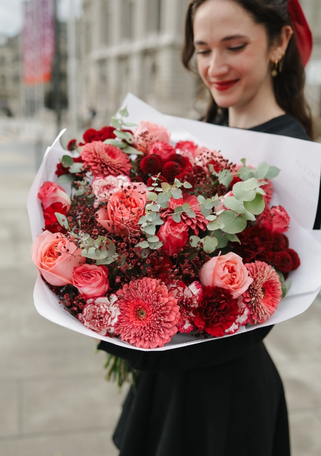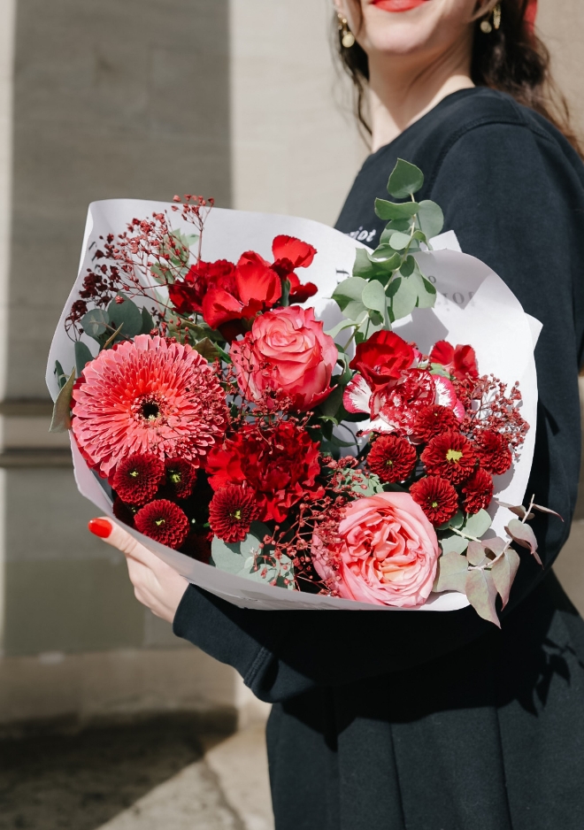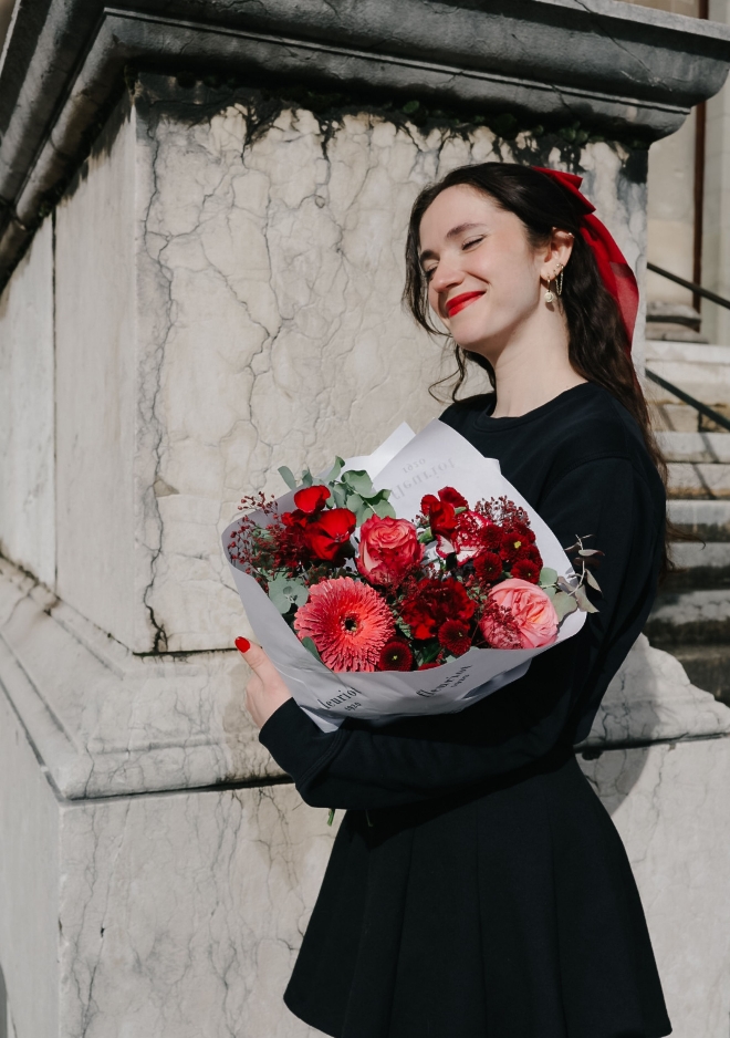 Le bouquet L.O.V.E est une composition audacieuse et vibrante, pensée comme une véritable déclaration florale. Il réunit de généreux germinis Big Sija, des roses Xpression au rose intense, des œillets rouge bordeaux profonds, de délicats chrysanthèmes santini rouges ainsi que de superbes œillets Solomio. Ce mélange pop et assumé joue subtilement entre le rouge bordeaux intense et le rose pink éclatant, créant un contraste moderne, chaleureux et plein de caractère. À la fois romantique et contemporain, L.O.V.E séduit par son énergie, sa texture et sa richesse visuelle. Un bouquet idéal pour célébrer l’amour, l’amitié ou simplement l’envie d’offrir une explosion de couleur et d’émotion.