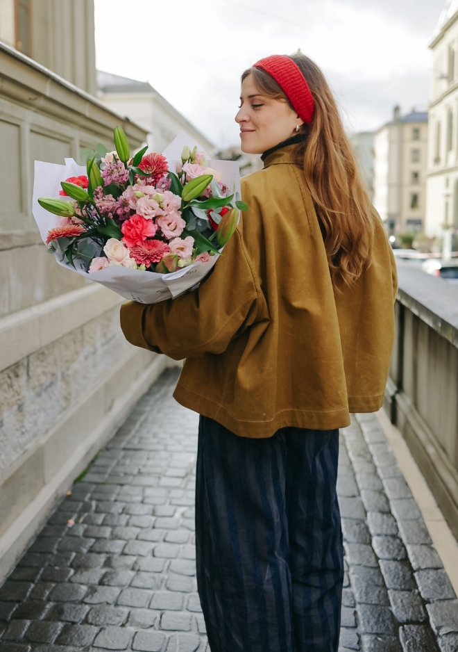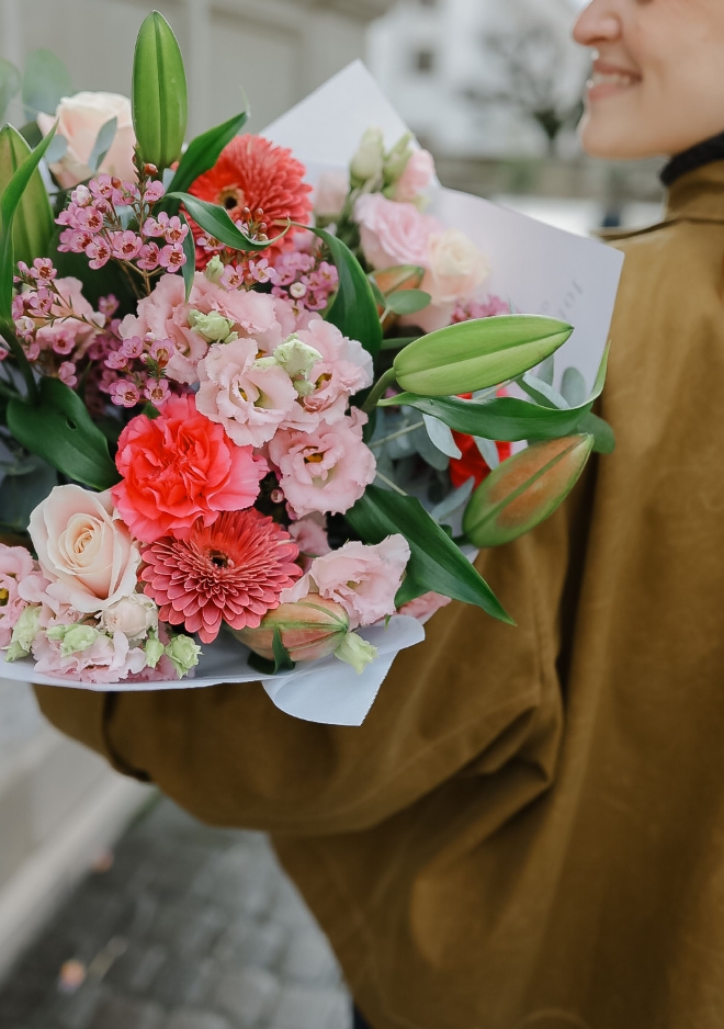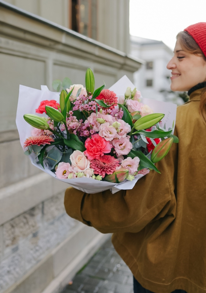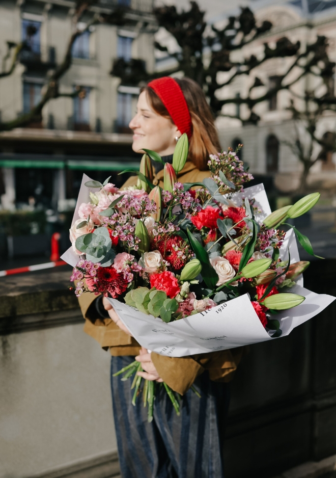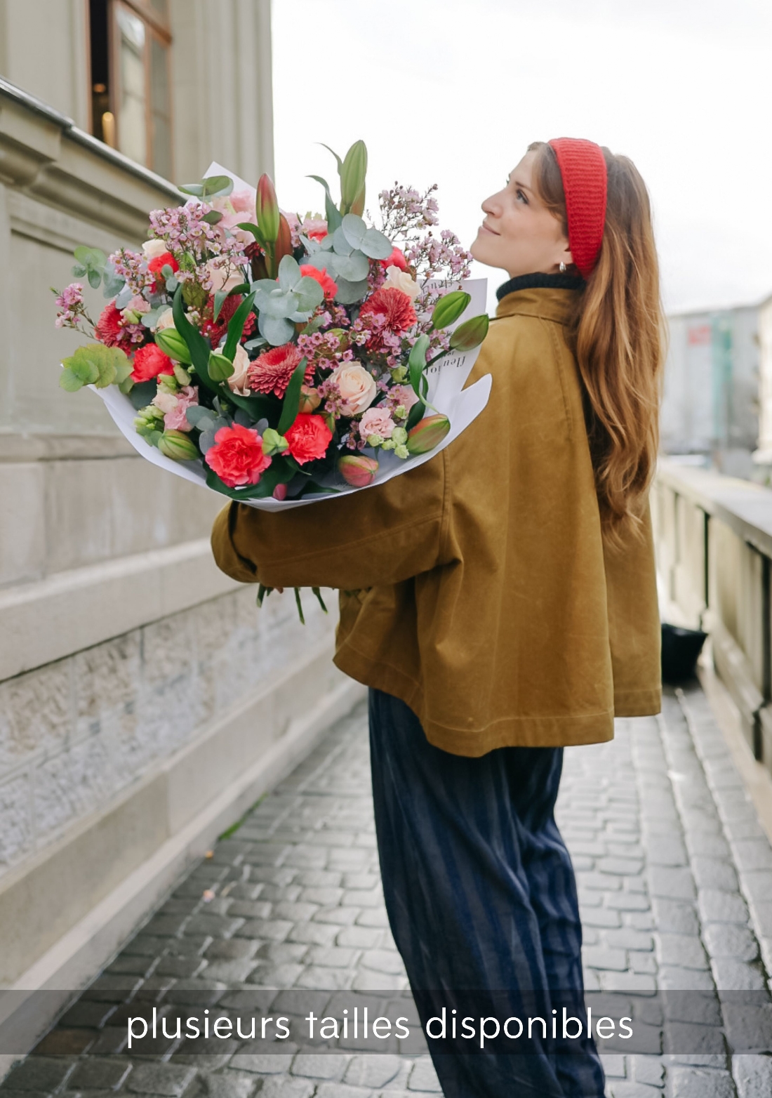 Le bouquet Kiss Me More est une composition généreuse et romantique, mêlant intensité et douceur dans un jeu subtil de textures et de nuances. Il associe de majestueux lys orientaux bordeaux, des roses Sweet Avalanche aux tons délicatement poudrés, des œillets fuchsia vibrants, de superbes lisianthus roses ainsi que de la fleur de cire aérienne. À mesure que les lys s’ouvrent, le bouquet révèle toute son ampleur et séduit par son volume spectaculaire. Peu odorants, ces lys conviennent particulièrement aux pièces spacieuses, où ils peuvent pleinement s’épanouir et structurer l’espace avec élégance. Une création florale expressive et raffinée, idéale pour marquer les esprits.
