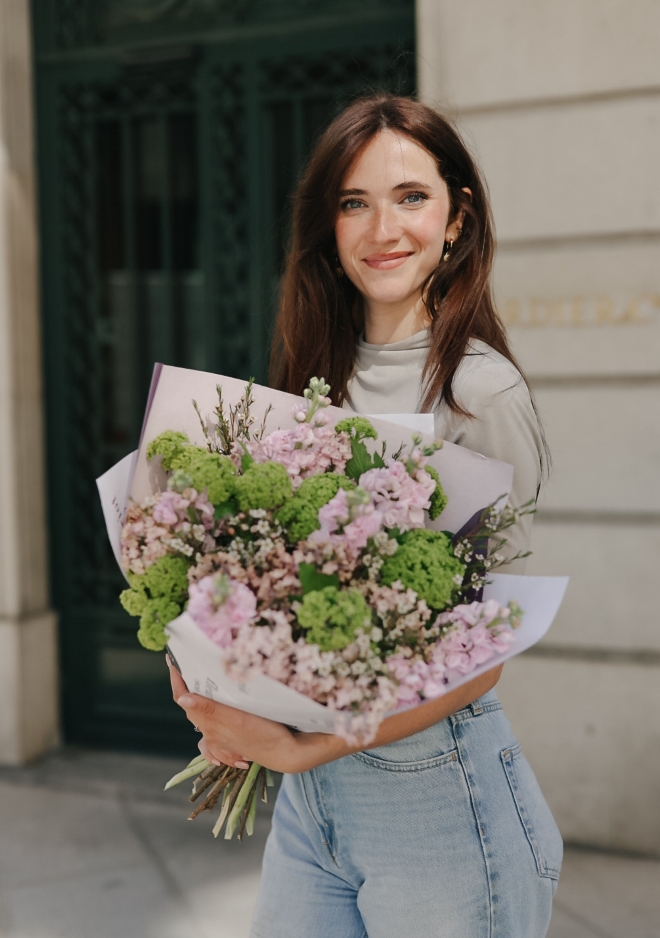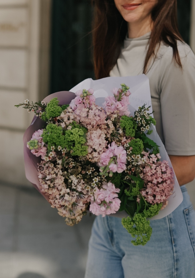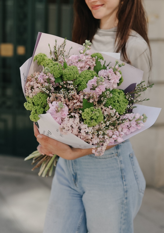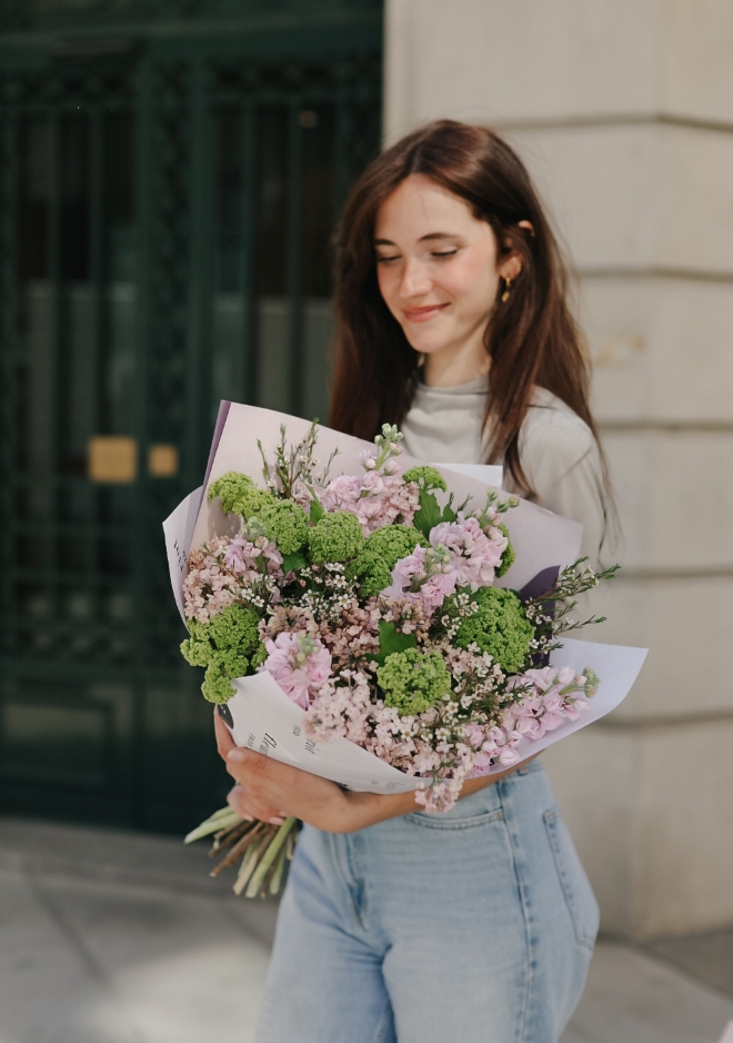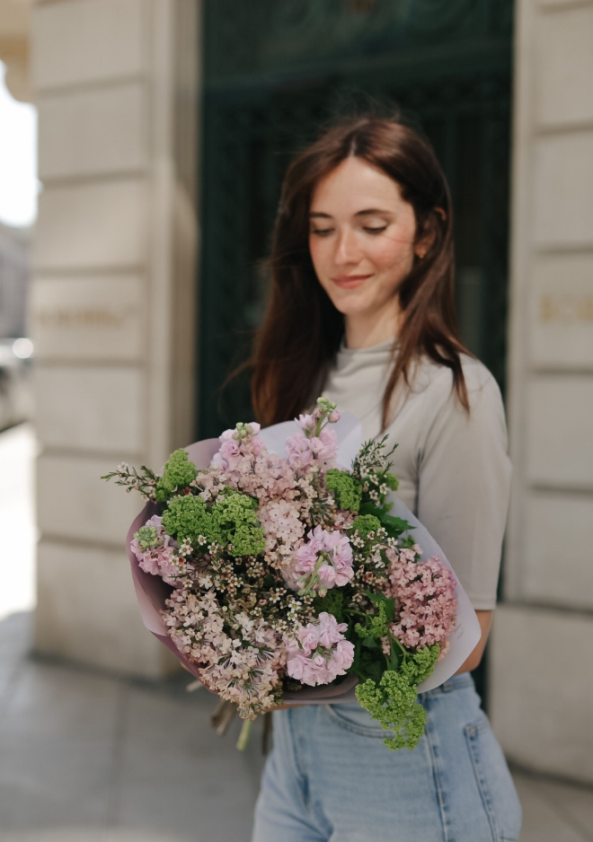 Notre bouquet à longues tiges Pink Haze, proposé en édition limitée, associe de superbes lilas Maidens Blush rose pâle, des giroflées parfumées aux tons rosés et de délicates branches de viburnum. Avec sa longueur généreuse d’environ 60 cm, ce bouquet raffiné apporte douceur, élégance et un parfum délicat à votre intérieur. Une création lumineuse et romantique, idéale pour célébrer la saison.