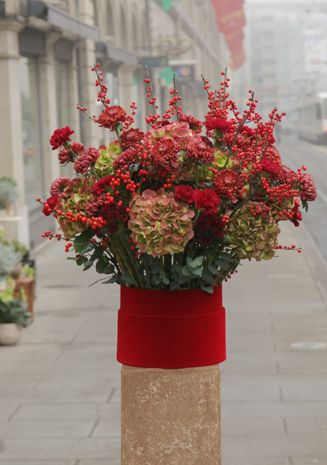 La boîte Velvet Ruby révèle toute la profondeur et l’élégance des rouges hivernaux. Pensée pour celles et ceux qui aiment les compositions audacieuses, elle marie des textures luxueuses et des teintes rubis intenses dans une harmonie chaleureuse. Elle est composée de chrysanthèmes Bigoudi Red, aux pétales graphiques et éclatants, d’hortensias rouges généreux, d’œillets bordeaux veloutés et d’ilex rouge de la région, qui apporte structure, rythme et une touche lumineuse naturelle. Un arrangement riche, sophistiqué et vibrant, idéal pour créer un impact floral puissant et célébrer la beauté intense de l’hiver.