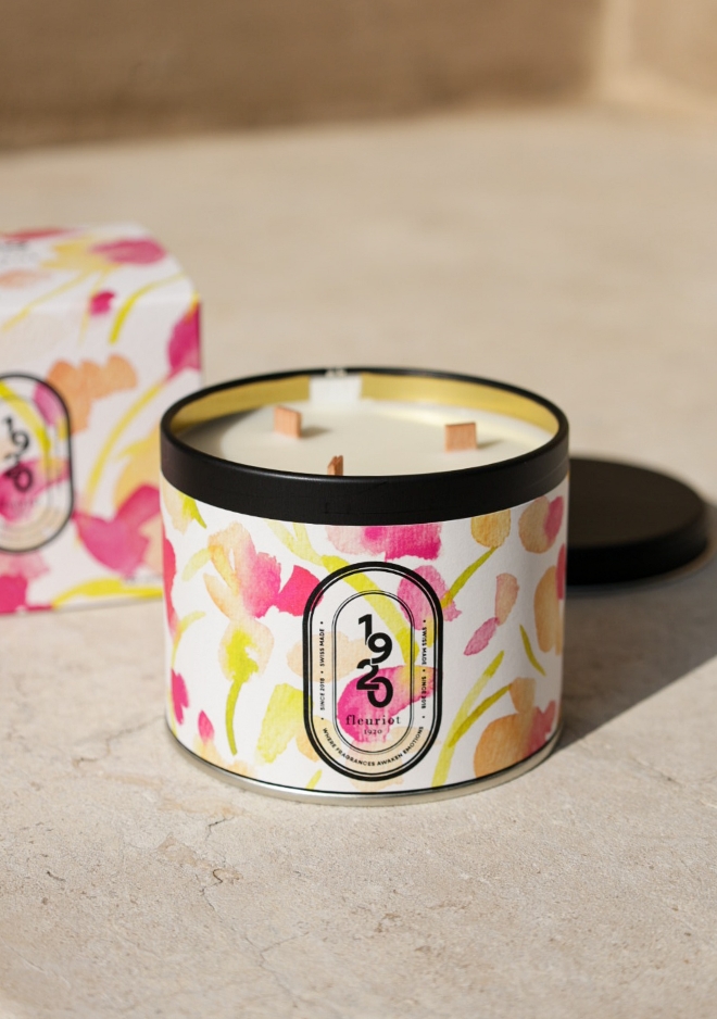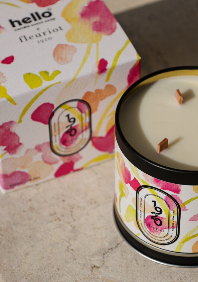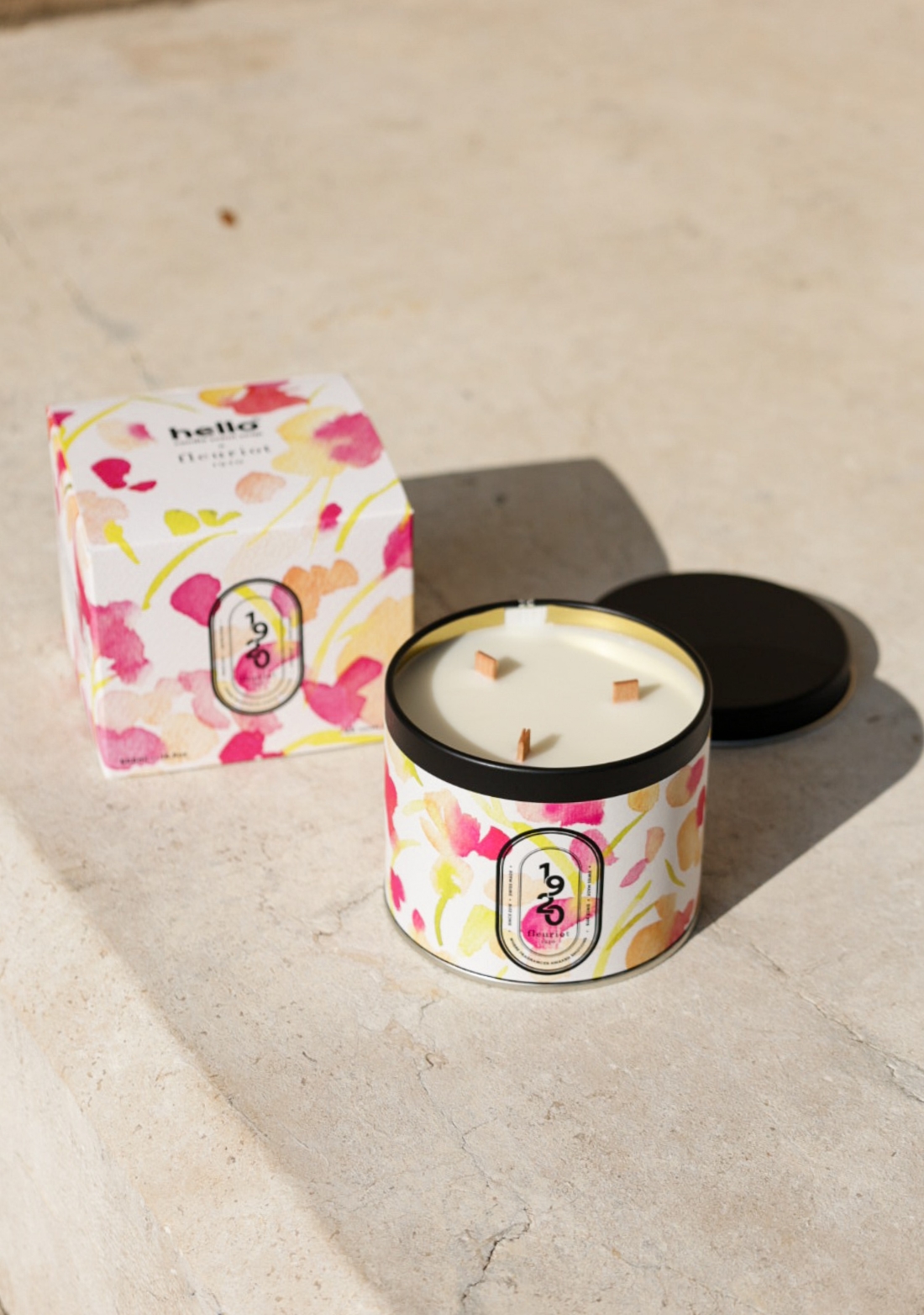 Chaque flamme évoque l’éclat d’un bouquet, le souffle d’un jardin, le parfum d’un matin calme. Une ode à la nature, née d’une passion partagée pour les formes, les couleurs, les senteurs. Un design vibrant, des notes délicates : une fleur qui ne fanera jamais. La bougie Hello Candle x Fleuriot 1920 capture une parenthèse enchantée. Son parfum dévoile l’alliance fraîche et croquante des pommiers en fleurs, la pureté aquatique de la fleur de lotus, et la chaleur profonde du bois de palissandre. Une fragrance à la fois lumineuse et réconfortante, qui invite à ralentir et savourer l’instant. L’écrin, habillé de rose tendre, d’orange vitaminé et de vert acidulé, rappelle un bouquet cueilli au lever du jour. Grâce au talent de Julie Thomas, illustratrice avec qui nous collaborons régulièrement, l’aquarelle vient donner vie au papier avec une délicatesse unique. Une création poétique et fraîche, pensée pour illuminer chaque intérieur d’un souffle de nature. ✨ Composition & engagement Cire 100% soja sans OGM, sans phtalates, sans CMR, non testée sur les animaux et issue d’une culture durable. 💡 Astuces d’utilisation : Laissez toujours brûler la bougie jusqu’à ce que la surface soit entièrement liquide, puis laissez-la refroidir. Ne la faites pas brûler plus de 2 heures d’affilée, afin de préserver toute sa longévité.