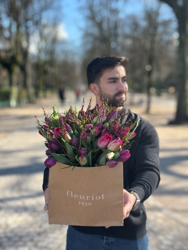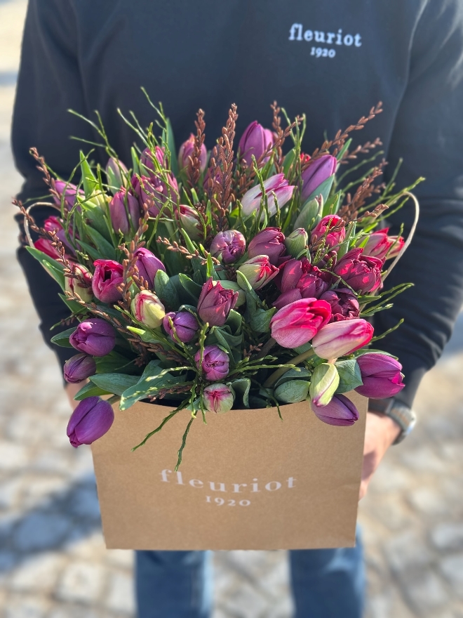 Une déclaration florale pleine de générosité. Avec ses 50 tulipes, ce bouquet offre volume et éclat. Fleuriot compose une palette de couleurs naturelles, guidée par l’inspiration et la disponibilité. Tulipes locales, Genève Région Terre Avenir, pour un cadeau qui fait sens. Comment entretenir votre bouquet de tulipes : Pour profiter pleinement de votre bouquet de tulipes, recoupez les tiges bien droites d’environ 1 à 2 cm dès réception, à l’aide d’un outil propre. Placez-les ensuite dans un vase avec peu d’eau fraîche (5 à 7 cm), que vous changerez régulièrement afin de préserver leur fraîcheur. Installez le bouquet dans un endroit lumineux, mais à l’abri du soleil direct, des sources de chaleur et des fruits. Les tulipes continuent à pousser et à se mouvoir naturellement dans le vase : ce mouvement fait partie de leur charme. Pour les aider à rester bien droites, vous pouvez les laisser quelques heures dans leur emballage après les avoir mises en eau. Les tulipes n’ont pas besoin de nourriture pour fleurs : une eau propre et renouvelée suffit.
