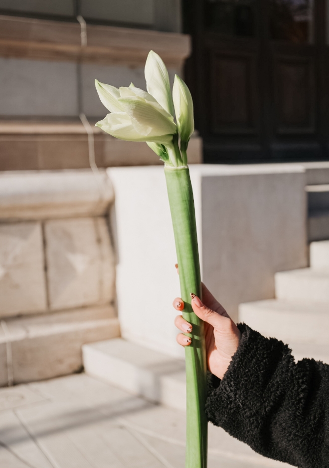Faites-vous plaisir avec nos fleurs à la pièce : sélectionnez vos coups de cœur, mélangez, assemblez, et repartez avec un bouquet unique. Ou glissez simplement une jolie tige en plus de votre sélection, pour une attention qui fait toujours son effet. Et en ce moment, découvrez notre amaryllis Mont-Blanc, une variété blanche éclatante aux grandes fleurs raffinées, qui apporte une touche lumineuse et élégante à toutes vos compositions.