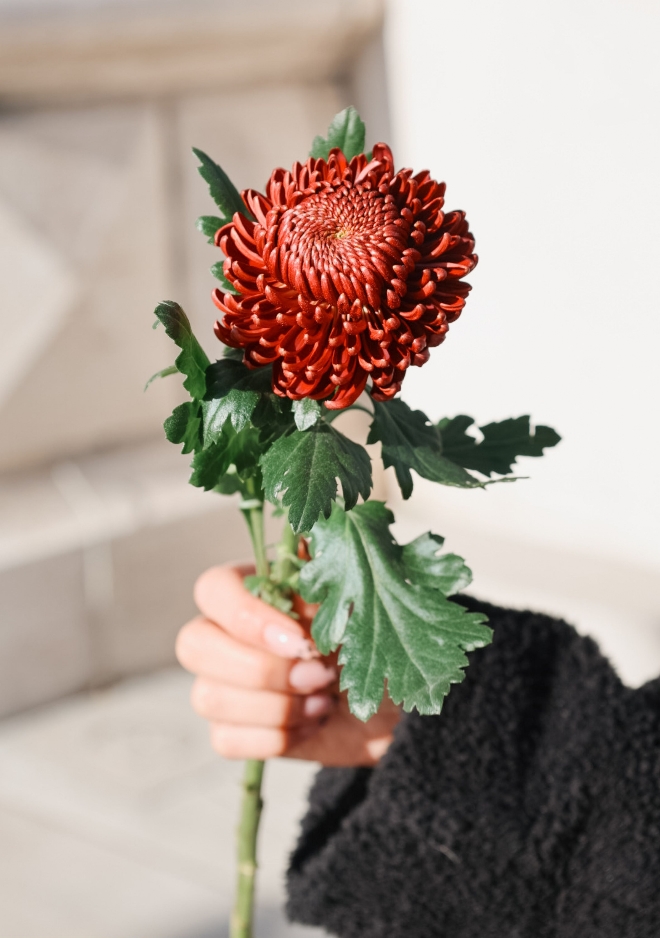 Faites-vous plaisir avec nos fleurs à la pièce : sélectionnez vos coups de cœur, mélangez, assemblez, et repartez avec un bouquet unique. Ou glissez simplement une jolie tige en plus de votre sélection, pour une attention qui fait toujours son effet. Et en ce moment, découvrez nos chrysanthèmes Bigoudi Red, une variété bicolore rouge profond, aux pétales graphiques qui attirent immédiatement le regard. Une fleur vive et originale, parfaite pour apporter du caractère et du contraste à vos compositions.