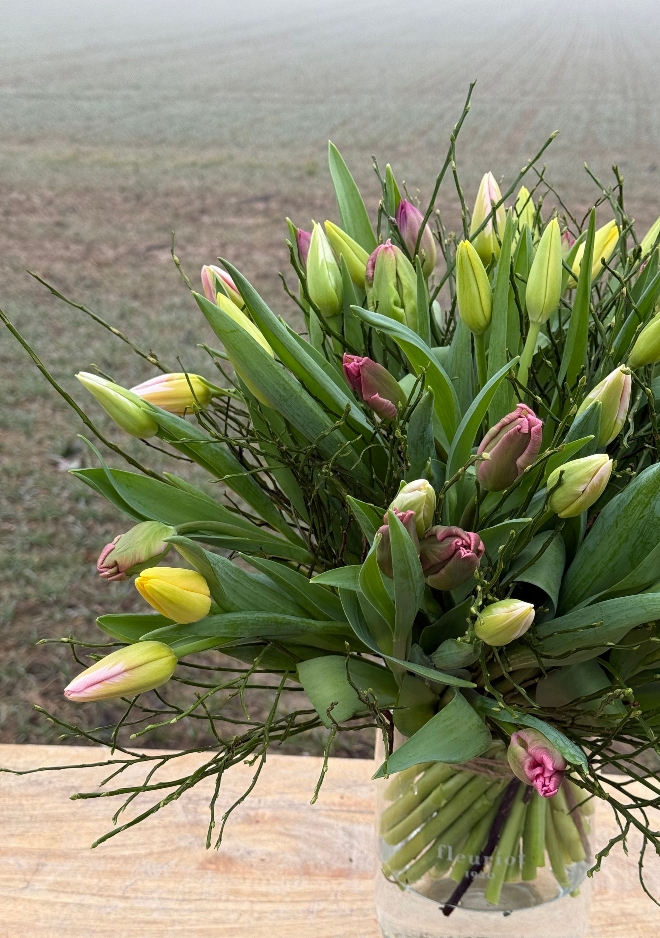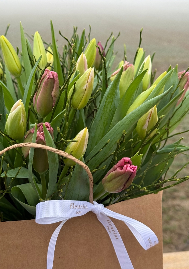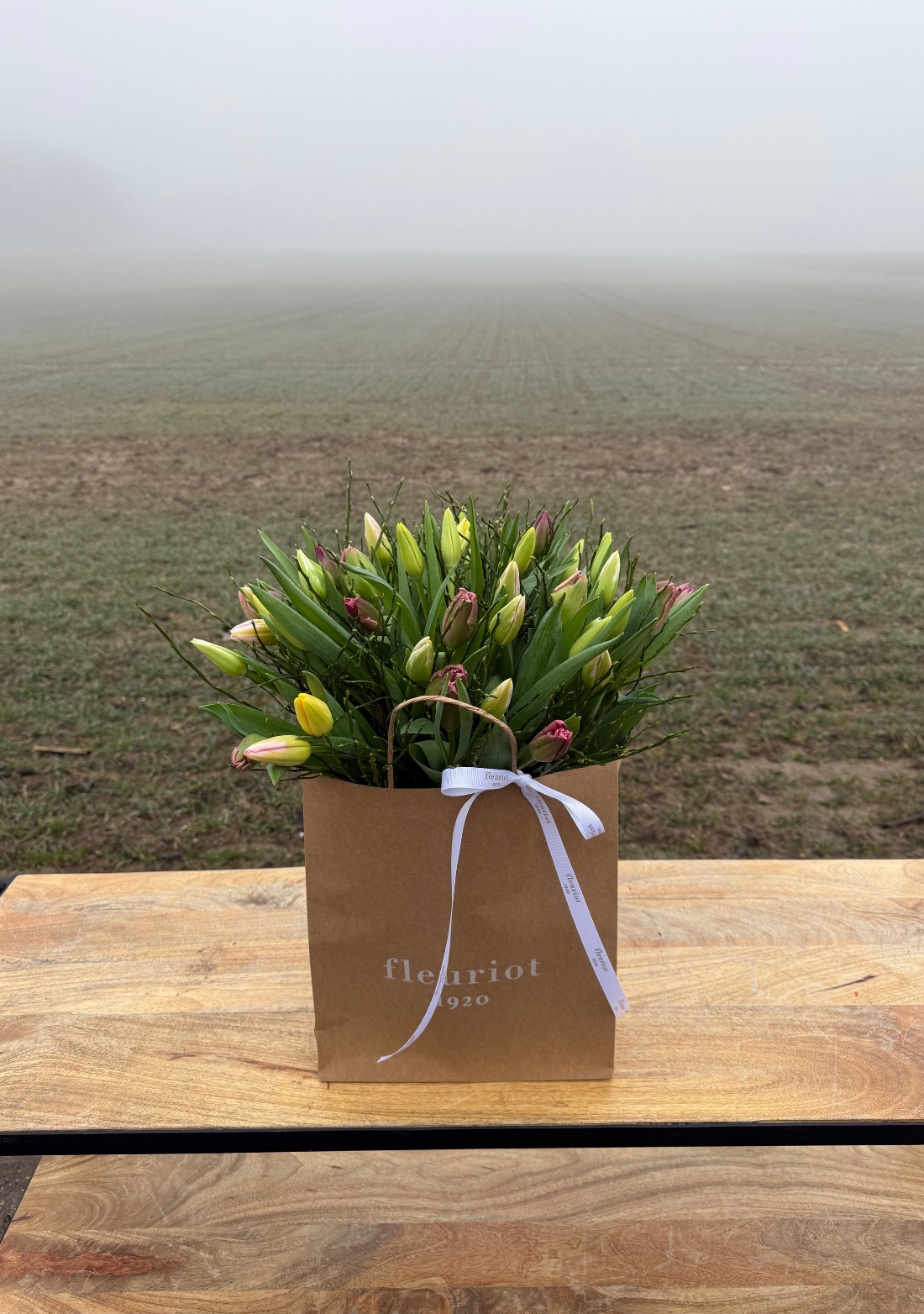 Une déclaration florale pleine de générosité. Avec ses 50 tulipes, ce bouquet offre volume et éclat. Fleuriot compose une palette de couleurs naturelles, guidée par l’inspiration et la disponibilité. Tulipes locales, Genève Région Terre Avenir, pour un cadeau qui fait sens. Comment entretenir votre bouquet de tulipes : Pour profiter pleinement de votre bouquet de tulipes, recoupez les tiges bien droites d’environ 1 à 2 cm dès réception, à l’aide d’un outil propre. Placez-les ensuite dans un vase avec peu d’eau fraîche (5 à 7 cm), que vous changerez régulièrement afin de préserver leur fraîcheur. Installez le bouquet dans un endroit lumineux, mais à l’abri du soleil direct, des sources de chaleur et des fruits. Les tulipes continuent à pousser et à se mouvoir naturellement dans le vase : ce mouvement fait partie de leur charme. Pour les aider à rester bien droites, vous pouvez les laisser quelques heures dans leur emballage après les avoir mises en eau. Les tulipes n’ont pas besoin de nourriture pour fleurs : une eau propre et renouvelée suffit.