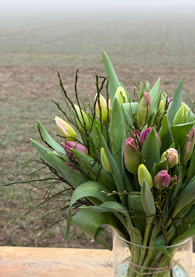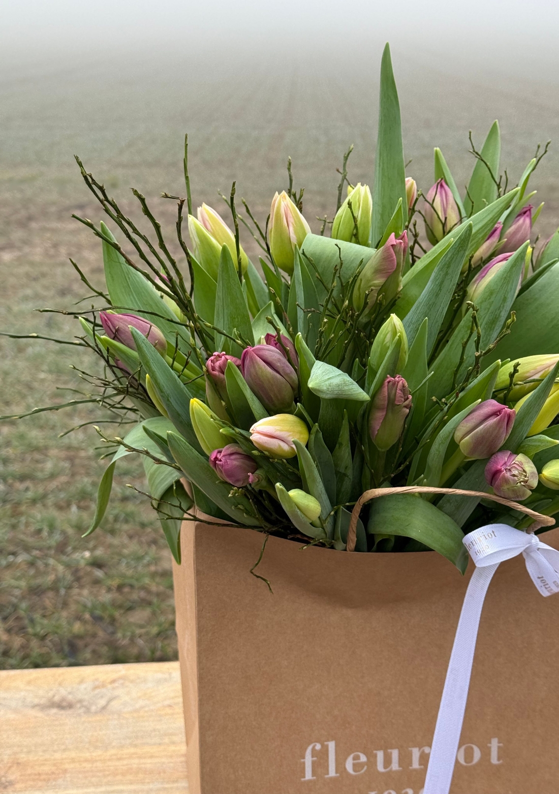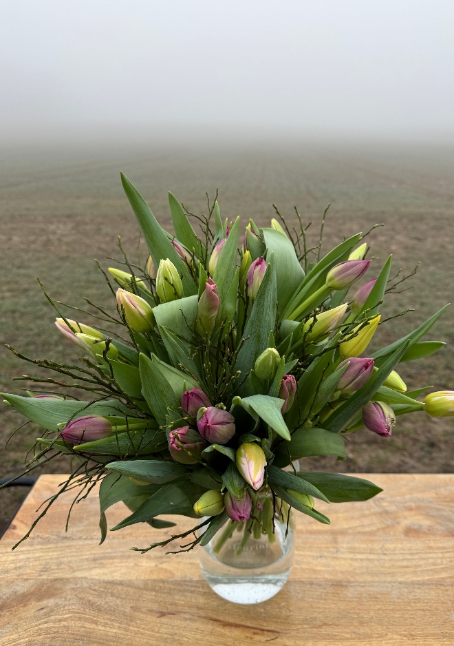 Une élégance naturelle, tout en harmonie. Ce bouquet de 40 tulipes célèbre la richesse des couleurs de saison, soigneusement assorties par Fleuriot. Des fleurs labellisées Genève Région Terre Avenir, synonymes de qualité et de proximité. Comment entretenir votre bouquet de tulipes : Pour profiter pleinement de votre bouquet de tulipes, recoupez les tiges bien droites d’environ 1 à 2 cm dès réception, à l’aide d’un outil propre. Placez-les ensuite dans un vase avec peu d’eau fraîche (5 à 7 cm), que vous changerez régulièrement afin de préserver leur fraîcheur. Installez le bouquet dans un endroit lumineux, mais à l’abri du soleil direct, des sources de chaleur et des fruits. Les tulipes continuent à pousser et à se mouvoir naturellement dans le vase : ce mouvement fait partie de leur charme. Pour les aider à rester bien droites, vous pouvez les laisser quelques heures dans leur emballage après les avoir mises en eau. Les tulipes n’ont pas besoin de nourriture pour fleurs : une eau propre et renouvelée suffit.