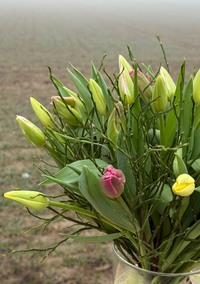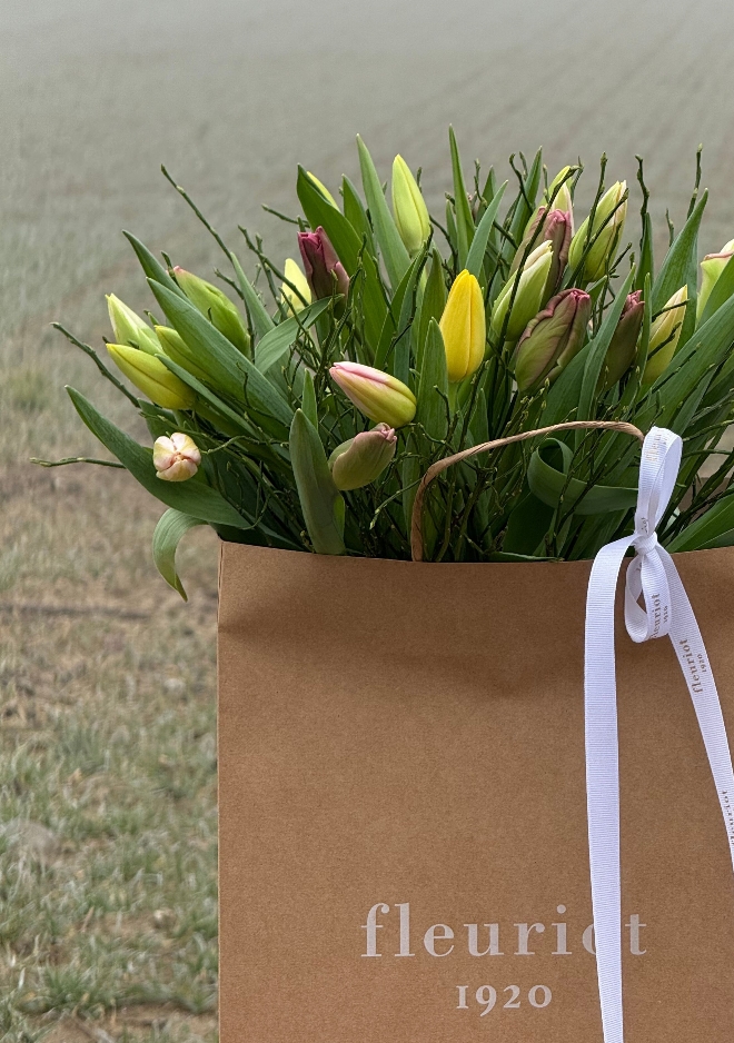 Une composition florale qui murmure la beauté des beaux jours. Composé de 30 tulipes, ce bouquet séduit par ses teintes équilibrées, imaginées par Fleuriot au fil des saisons. Des fleurs locales et responsables, Genève Région Terre Avenir, pour un instant de poésie florale. Comment entretenir votre bouquet de tulipes : Pour profiter pleinement de votre bouquet de tulipes, recoupez les tiges bien droites d’environ 1 à 2 cm dès réception, à l’aide d’un outil propre. Placez-les ensuite dans un vase avec peu d’eau fraîche (5 à 7 cm), que vous changerez régulièrement afin de préserver leur fraîcheur. Installez le bouquet dans un endroit lumineux, mais à l’abri du soleil direct, des sources de chaleur et des fruits. Les tulipes continuent à pousser et à se mouvoir naturellement dans le vase : ce mouvement fait partie de leur charme. Pour les aider à rester bien droites, vous pouvez les laisser quelques heures dans leur emballage après les avoir mises en eau. Les tulipes n’ont pas besoin de nourriture pour fleurs : une eau propre et renouvelée suffit.