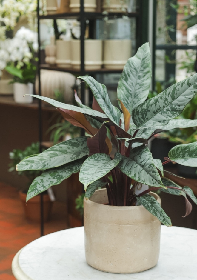 Aglaonema argenté en céramique brute beige – Ø 15 cm Apportez une touche d’élégance végétale à votre intérieur avec cet Aglaonema aux feuilles argentées, subtilement mises en valeur par un revers bordeaux raffiné. Cette plante d’intérieur, aussi graphique que décorative, est présentée dans une céramique brute de couleur beige, qui souligne son aspect naturel et intemporel. L’Aglaonema est apprécié pour sa facilité d’entretien et sa résistance, même dans des conditions de lumière modérée. Originaire d’Asie tropicale, il est souvent considéré comme une plante porte-bonheur et s’intègre parfaitement dans tous les styles d’intérieur. ✨ Le saviez-vous ? L’Aglaonema est reconnu comme une plante dépolluante, idéale pour améliorer la qualité de l’air intérieur. Ses nuances argentées et bordeaux en font une variété particulièrement recherchée pour son contraste décoratif. Il symbolise la longévité et la prospérité dans plusieurs cultures asiatiques. Un choix parfait pour offrir ou pour s’offrir une plante d’intérieur raffinée et facile à vivre.