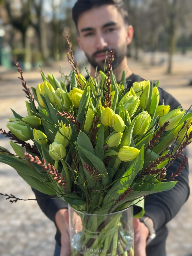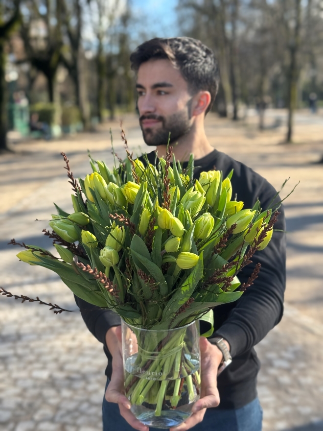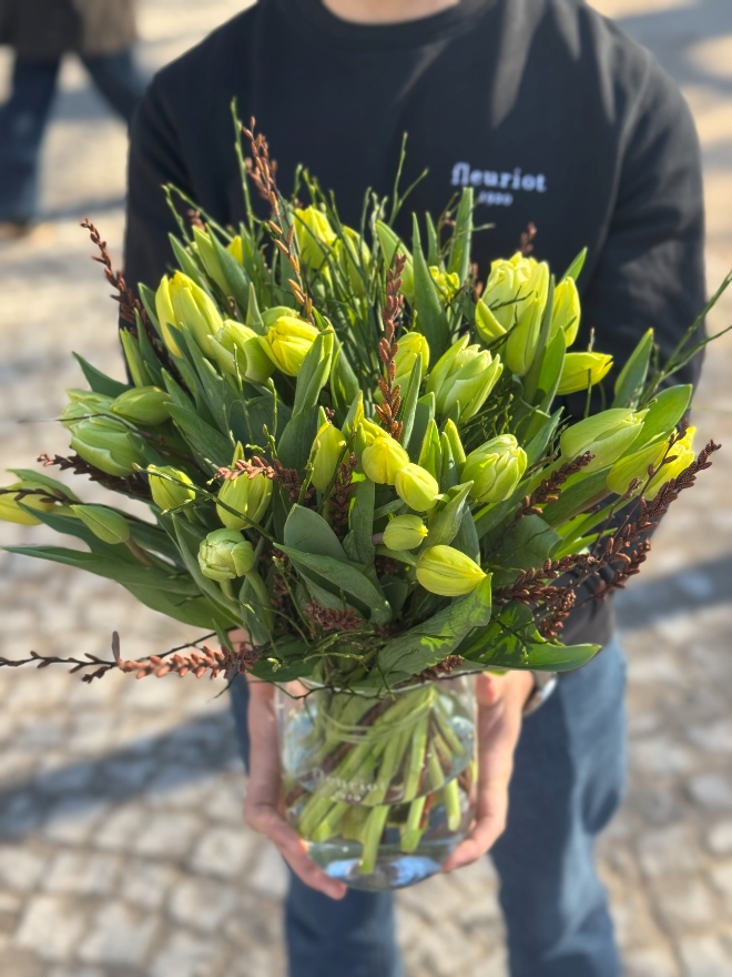 Une élégance naturelle, tout en harmonie. Ce bouquet de 40 tulipes célèbre la richesse des couleurs de saison, soigneusement assorties par Fleuriot. Des fleurs labellisées Genève Région Terre Avenir, synonymes de qualité et de proximité. Comment entretenir votre bouquet de tulipes : Pour profiter pleinement de votre bouquet de tulipes, recoupez les tiges bien droites d’environ 1 à 2 cm dès réception, à l’aide d’un outil propre. Placez-les ensuite dans un vase avec peu d’eau fraîche (5 à 7 cm), que vous changerez régulièrement afin de préserver leur fraîcheur. Installez le bouquet dans un endroit lumineux, mais à l’abri du soleil direct, des sources de chaleur et des fruits. Les tulipes continuent à pousser et à se mouvoir naturellement dans le vase : ce mouvement fait partie de leur charme. Pour les aider à rester bien droites, vous pouvez les laisser quelques heures dans leur emballage après les avoir mises en eau. Les tulipes n’ont pas besoin de nourriture pour fleurs : une eau propre et renouvelée suffit.